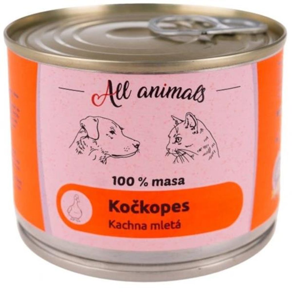 ALL ANIMALS Kočkopes konz. kachna mletá 200g ALL ANIMALS Kočkopes konz. kachna mletá 200g Hlavní přednosti monoproteinové konzervy (monoprotein = maso z jednoho živočišného zdroje): vhodná pro jedince s citlivým zažíváním, alergiemi a potravinovou intolerancí, velmi chutné, výživné a snadno stravitelné krmivo, pomáhá zlepšit příjem krmiva, šetrné zpracování zaručuje lahodnou chuť i vůni, pro všechna plemena a věkové kategorie psů a koček, vyrobeno v?České republice z lokálních surovin. Konzerva neobsahuje masovou ani kostní moučku, umělé vitamíny, syntetické zvýrazňovače chuti, umělá aromata, barviva ani emulgátory. Díky absenci lepku a laktózy je vhodná i pro alergiky a lze ji kombinovat s dalšími přílohami. Složení: 100 % kachna (bez vnitřností, hlav a pařátků) Analytické složky: hrubý protein 16,9 %, hrubé oleje a tuky 9,73 %, hrubá vláknina <1 %, hrubý popel 4,97 %, vlhkost 60,5 %, vysoký přirozený obsah vitamínů (A, E, D) a aminokyselin (lysin, methionin, cystin). Dávkování: hmotnost psa denní dávka 5 kg 200 g 10 kg 400 g 20 kg 600 g 30 kg 800 g Denní dávka se může lišit v závislosti na aktivitě zvířete, jeho kondici a prostředí, v němž žije. V případě podávání pro zvýšení rozmanitosti stravy a chuti k jídlu nezapomeňte v odpovídající míře snížit denní dávku pravidelného krmiva. Zvíře by mělo mít neustále k dispozici čerstvou pitnou vodu.