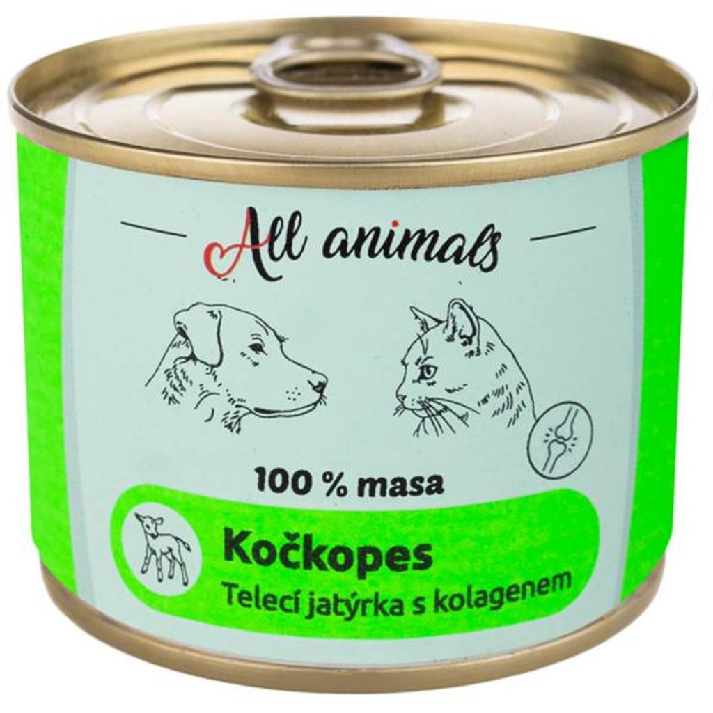 ALL ANIMALS Kočkopes konz. telecí jatýrka s kolagenem 200g ALL ANIMALS Kočkopes konz. telecí jatýrka s kolagenem 200g Monoproteinová konzerva s kolagenem představuje superprémiové krmivo pro psy a kočky všech velikostí a plemen. Obsahuje hrubě mletá telecí játra doplněná o kolagen, který podporuje funkce pohybového aparátu. Konzerva je vyrobena bez obilovin, dochucovadel, konzervačních a barvících látek. Jde o velmi chutné, výživné a snadno stravitelné krmivo. Šetrné zpracování zaručuje lahodnou chuť i vůni. Vyrobeno v?České republice z lokálních surovin. Telecí játra jsou vynikajícím zdrojem bílkovin, vitamínů i minerálů. Díky svým nutričním hodnotám jsou oblíbenou součástí jídelníčku. Kolagen je bílkovina, která zvyšuje pevnost a odolnost chrupavek a posiluje šlachy a vazy. Podporuje správnou funkčnost pohybového aparátu a je nejlepší prevencí vzniku pohybových potíží. Složení: 100 % telecí játra Analytické složky: hrubý protein 22 %, hrubé oleje a tuky 1,85 %, hrubá vláknina 0,5 %, hrubý popel 1,18 %, vlhkost 70 %, vysoký přirozený obsah vitamínů (A, E, D), aminokyselin (lyzin, methionin, cystin), kolagen 0,5 mg. Dávkování: Denní dávka se může lišit v závislosti na aktivitě zvířete, jeho kondici a prostředí, v němž žije. V případě podávání pro zvýšení rozmanitosti stravy a chuti k jídlu nezapomeňte v odpovídající míře snížit denní dávku pravidelného krmiva. Zvíře by mělo mít neustále k dispozici čerstvou pitnou vodu.