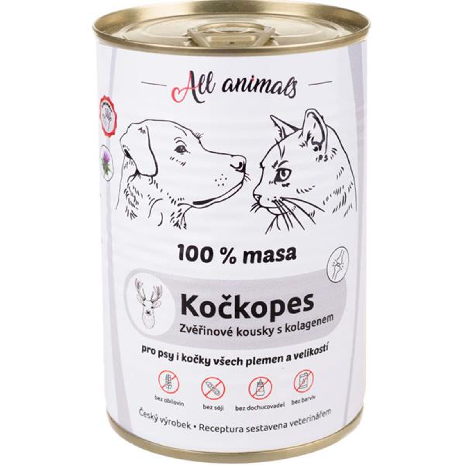 ALL ANIMALS Kočkopes konz. zvěřinové kousky s kolagenem 400g ALL ANIMALS Kočkopes konz. zvěřinové kousky s kolagenem 400g Čistě přírodní konzerva All Animals se zvěřinou a kolagenem přináší superprémiové krmivo pro psy a kočky všech velikostí a plemen. Hlavní předností zvěřiny oproti masu hospodářských zvířat je vysoký obsah bílkovin s mimořádnou biologickou hodnotou a nízký obsah tuku a cholesterolu. Kolagen podporuje funkčnost pohybového aparátu. Krmivo je velmi chutné, výživné a snadno stravitelné. Neobsahuje žádné obiloviny, dochucovadla, konzervanty, umělá barviva ani geneticky modifikované suroviny. Šetrné zpracování zaručuje lahodnou chuť i vůni. Vyrobeno v České republice z lokálních surovin a s přídavkem oleje z ostropestřce mariánského. Hlavní přednosti: vhodná pro jedince s citlivým zažíváním, alergiemi a potravinovou intolerancí, velmi chutné, výživné a snadno stravitelné krmivo, pomáhá zlepšit příjem krmiva u zvířat trpících nechutenstvím, šetrné zpracování zaručuje lahodnou chuť i vůni, pro všechna plemena a věkové kategorie psů a koček, vyrobeno v České republice z lokálních surovin. Složení: 100% zvěřina – jelen a daněk (bez vnitřností a kostí) Analytické složky: hrubý protein 20 %, hrubý tuk 5,36 %, hrubá vláknina 0,5 %, hrubý popel 1,07 %, vlhkost 72,8 %, vysoký přirozený obsah vitamínů (A, E, D), aminokyselin (lyzin, metionin, cystin), kolagen 0,5 mg. Dávkování: hmotnost psa denní dávka 5 kg 200 g 10 kg 400 g 20 kg 600 g 30 kg 800 g Denní dávka se může lišit v závislosti na aktivitě zvířete, jeho kondici a prostředí, v němž žije. V případě podávání pro zvýšení rozmanitosti stravy a chuti k jídlu nezapomeňte v odpovídající míře snížit denní dávku pravidelného krmiva. Zvíře by mělo mít neustále k dispozici čerstvou pitnou vodu.