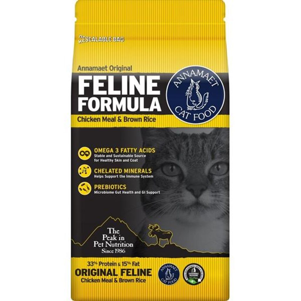 Annamaet Feline Chicken & Fish (kočka) 9,07 kg (20lb) Annamaet Feline Chicken & Fish (kočka) 1,81 kg (4lb) Annamaet Feline Original je receptura vyhlášená svou výjimečnou chutí. Je vyrobena z kvalitních kuřat, celozrnné rýže, bílých mořských ryb a sleďů, bez použití kukuřice a pšenice. Krmivo je určené pro kočky ve všech životních stádiích. Holistická receptura, konzervována pouze přirozeně. Receptura bez obsahu kukuřice a pšenice. Řasy (mořské mikroskopické) a menhadenový olej (olej s malých sleďovitých rybek) jsou vynikající přírodní zdroje omega 3 mastných kyselin pro hebký kožíšek vaší kočky. Bílá mořská ryba = štikozubec pacifický (Merluccius productus) - lov respektuje pravidla pro trvale udržitelný rybolov. Moučky z bílých mořských ryb a sleďů – dodávají jedinečnou chuť a aroma. Brusinky jako silný antioxidant, který podporuje zdraví močového traktu. Složení: Kuřecí moučka, celozrnná rýže, kuřecí tuk (konzervovaný směsí tokoferolů přirozeného původu (vitamín E)), ovesné vločky, proso, moučka z bílých mořských ryb (štikozubec pacifický), ječné kroupy, sušená vejce, moučka ze sleďů, sušená řepná dužina, menhadenový olej (konzervovaný směsí tokoferolů přirozeného původu (vitamín E)), sušené pivovarské kvasnice, hrachový protein, mořské mikrořasy (zdroj mastných kyselin), brusinky, borůvky, přírodní aroma, chlorid draselný, taurin, Lactobacillus Acidophilus – sušený produkt fermentace, oligofruktóza, chlorid sodný. Analytické složky: Hrubý protein 33,0 %, hrubé oleje a tuky 15,0 %, hrubá vláknina 3,0 %, hrubý popel 7,5 %, vlhkost 10,0 %, vápník 1,3 %, fosfor 1,05 %, omega 6 mastné kyseliny 3,75 %, omega 3 mastné kyseliny 0,9 %, DHA 0,3 %, hořčík 0,13 %. Metabolizovatelná energie 4022 kcal/kg. Doplňkové látky: Nutriční doplňkové látky/kg: Vitamín A 29.255 m.j., vitamín D3 1.111 m.j., vitamín E 309 m.j., železo (chelát železa) 231 mg, jód (jodičnan vápenatý) 1,91 mg, měď (chelát mědi) 21,2 mg, mangan (chelát manganu) 45,3 mg, zinek (chelát zinku) 190,6 mg, selen (seleničitan sodný) 0,48 mg. Dávkování: Doporučená denní krmná dávka hmotnost kočky množství množství do 2,5 kg 35-71 g 1/3-2/3 hrnku 2,5-4 kg 71-80 g 2/3-3/4 hrnku 4-5,5 kg 80-107 g 3/4-1 hrnek 5,5-7 kg 107-134 g 1-1+1/4 hrnku