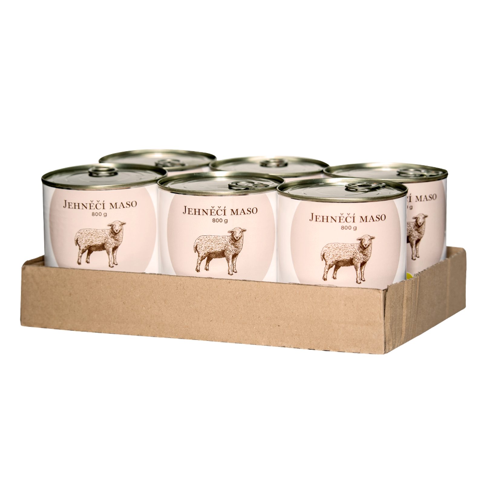 Balení šesti konzerv s výjimečně vysokým obsahem jehněčího masa z plemene Charollais – 70 %.