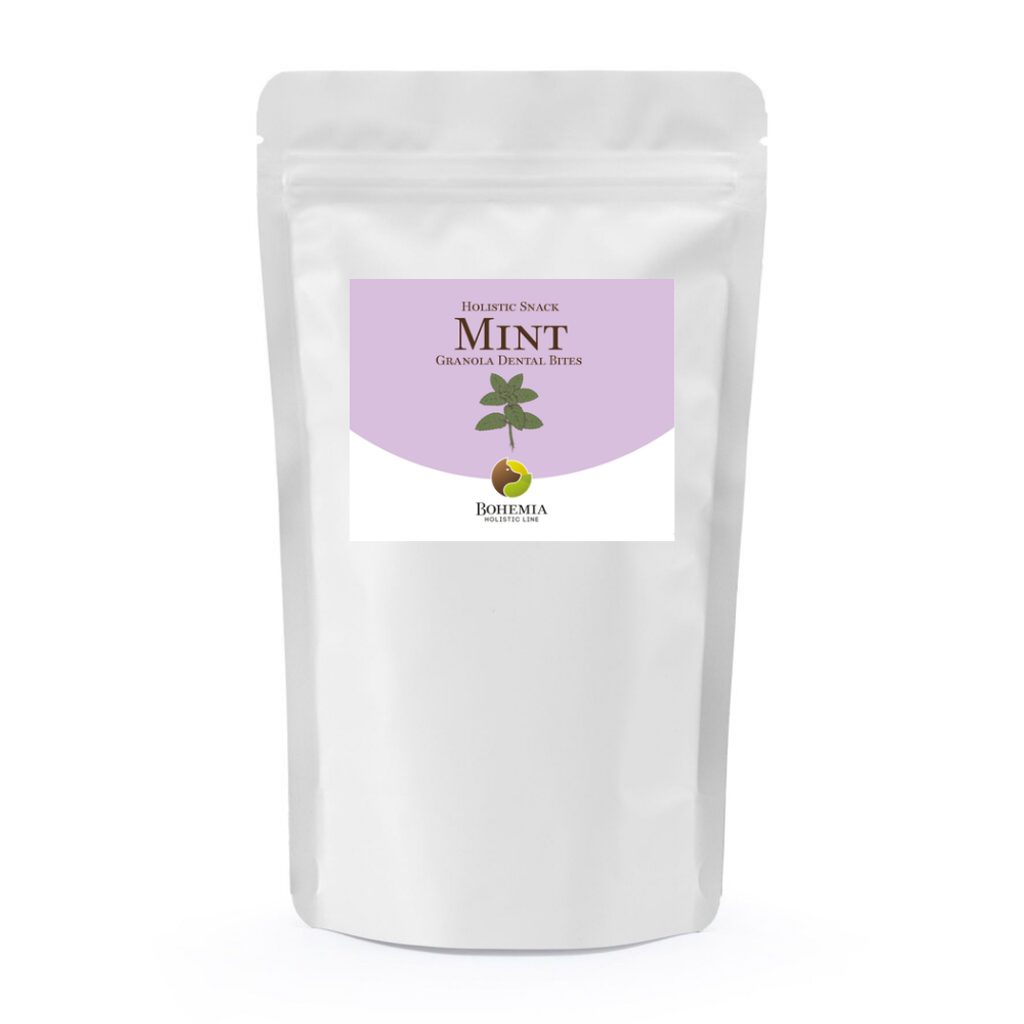 Lahodné psí pamlsky s granolou a mátou pro svěží dech. Tyto pamlsky pomáhají předcházet zubnímu plaku a zubnímu kameni díky aktivním složkám.