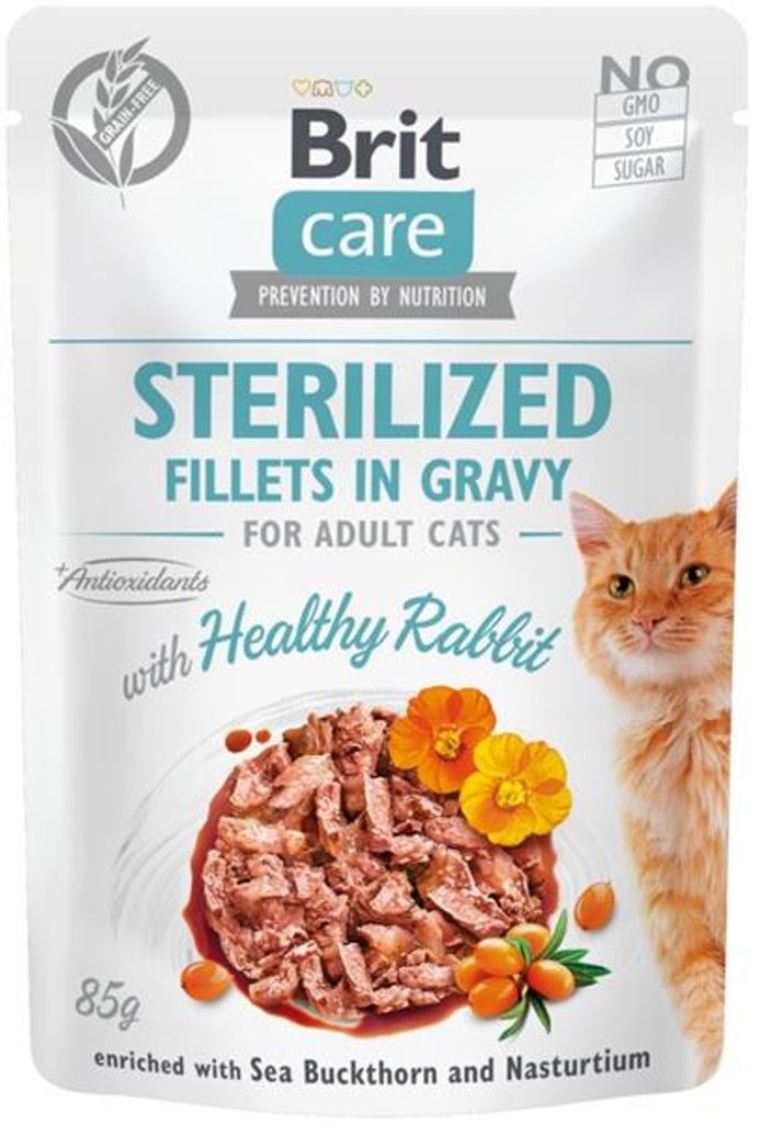 Brit Care Cat kaps. Sterilized. Fillets in Gravy with Healthy Rabbit 85 g Brit Care Cat kaps. Sterilized. Fillets in Gravy with Healthy Rabbit 85 g Kompletní superprémiové bezobilné krmivo pro dospělé kastrované kočky. Filetky ve šťávě s králíkem obohacené o rakytník a lichořeřišnici. Kočičí jídelníček by měl být pestrý, chutný a zdraví prospěšný. Lahodná Brit Care kapsička poslouží jako kompletní krmivo nebo jako doplněk k suchému krmivu pro zvýšení rozmanitosti a chuti. Je vhodná zejména pro velmi vybíravé kočky nebo kočky s problematickým příjmem krmiva. Díky přidanému rakytníku a lichořeřišnici pomáhá v prevenci proti chorobám močových cest. Bezobilná receptura 85 % masa ve filetech Vysoká chutnost Obsahuje přírodní antioxidanty: výtažek z rozmarýnu Bez přidaného cukru, sóji a GMO Složení: 85 % masa ve filetech (62 % kuře, 15 % játra, 8 % králík), vývar, 1 % rakytník, 0,5 % lichořeřišnice, minerály, hrachový škrob. Analytické složky: Hrubý protein 9 %, hrubý tuk 3 %, hrubá vláknina 0,5 %, hrubý popel 2 %, vlhkost 82 %, vápník 0,25 %, fosfor 0,2 %, sodík 0,3 %. Nutriční složení: Vitamin D3 250 IU, vitamin E 150 mg, biotin 0,5 mg, zinek 12 mg, mangan 3 mg, železo 10 mg, měď 0,4 mg, jód 0,7 mg, taurin 500 mg, L-methionin 2 000 mg. Obsahuje přírodní antioxidanty: tokoferoly z extraktu rostlinných olejů, askorbyl-palmitát a výtažek z rozmarýnu. Dávkování: Doporučená denní dávka je uvedena v krmné tabulce, ale může se lišit v závislosti na věku, aktivitě a prostředí vaší kočky. Vždy poskytněte misku s čerstvou vodou. Podávejte při pokojové teplotě. Pokud podáváte pro zvýšení rozmanitosti a chuti, nezapomeňte snížit doporučenou denní dávku pravidelné stravy vaší kočky. Po otevření uchovejte v lednici. Doporučená denní krmná dávka hmotnost množství 3 kg 2 ks 4 - 6 kg 3 - 4 ks 6 - 8 kg 4 - 6 ks