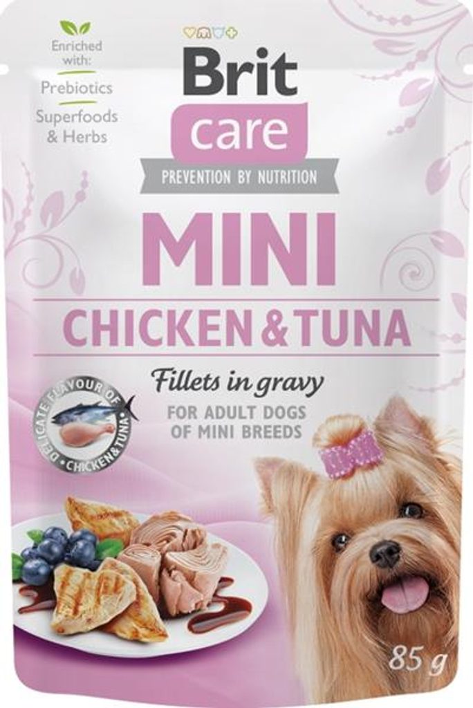 Brit Care Mini Dog kaps. Chicken&Tuna fillets in gravy 85 g Brit Care Mini Dog kaps. Chicken&Tuna fillets in gravy 85 g Jemné krájené filetky s kuřetem a tuňákem v omáčce. Toto krmivo pro malé psy je díky čerstvým proteinům lehce stravitelné a velmi chutné. Přírodní aditiva pro podporu imunity působí u malých pejsků jako prevence. Nízký glykemický index krmiva pomáhá předcházet vzniku obezity a přispívá k nižší zátěži trávicího traktu a ke stabilizaci hladiny krevního cukru. V kostce: cíleno na specifické potřeby mini psů, prebiotika pro lepší trávení, podpora imunity a kondice. Hlavní přednosti: velmi chutné, obohaceno o prebiotika pro dobré trávení, obsahuje rozmarýn, kurkumu, hřebíček, citrusy a borůvky, velmi vhodné pro vybíravé psy, vyrobeno v České republice. Složení: 45 % maso a vedlejší výrobky živočišného původu ve filetech (4 % kuře), 35 % ryby a výrobky rybího původu ve filetech (4 % tuňák), 9,6 % masová šťáva, 1,5 % byliny a ovoce (hřebíček, citrusy, rozmarýn, kurkuma), 0,5 % borůvky, 1 % minerály, 1 % lososový olej, 0,5 % mannan-oligosacharidy, 0,5 % frukto-oligosacharidy, 0,4 % inulin. Analytické složky: hrubý protein 8 %, hrubé oleje a tuky 4 %, hrubý popel 2 %, hrubá vláknina 0,4 %, vlhkost 82 %, vápník 0,3 %, fosfor 0,2 %, sodík 0,5 %. Nutriční doplňkové látky na 1 kg: vitamín D3 (E671) 250 m.j., vitamín E (3a700) 100 mg, zinek (3b606) 15 mg, železo (3b103) 10 mg, mangan (3b502) 3 mg, jód (3b201) 0,75 mg, měď (E4) 0,5 mg, biotin (3a880) 0,2 mg. Bez umělých aromat. Bez konzervantů. Metabolizovatelná energie: 820 kcal/kg Krmný návod: Hmotnost psa Denní dávka 2–5 kg 2–3,5 ks 5–10 kg 3,5–6 ks Údaje uvedené v tabulce jsou pouze orientační. Krmnou dávku upravujte dle individuálních potřeb zvířete a dbejte, aby mělo neustále k dispozici čerstvou pitnou vodu.
