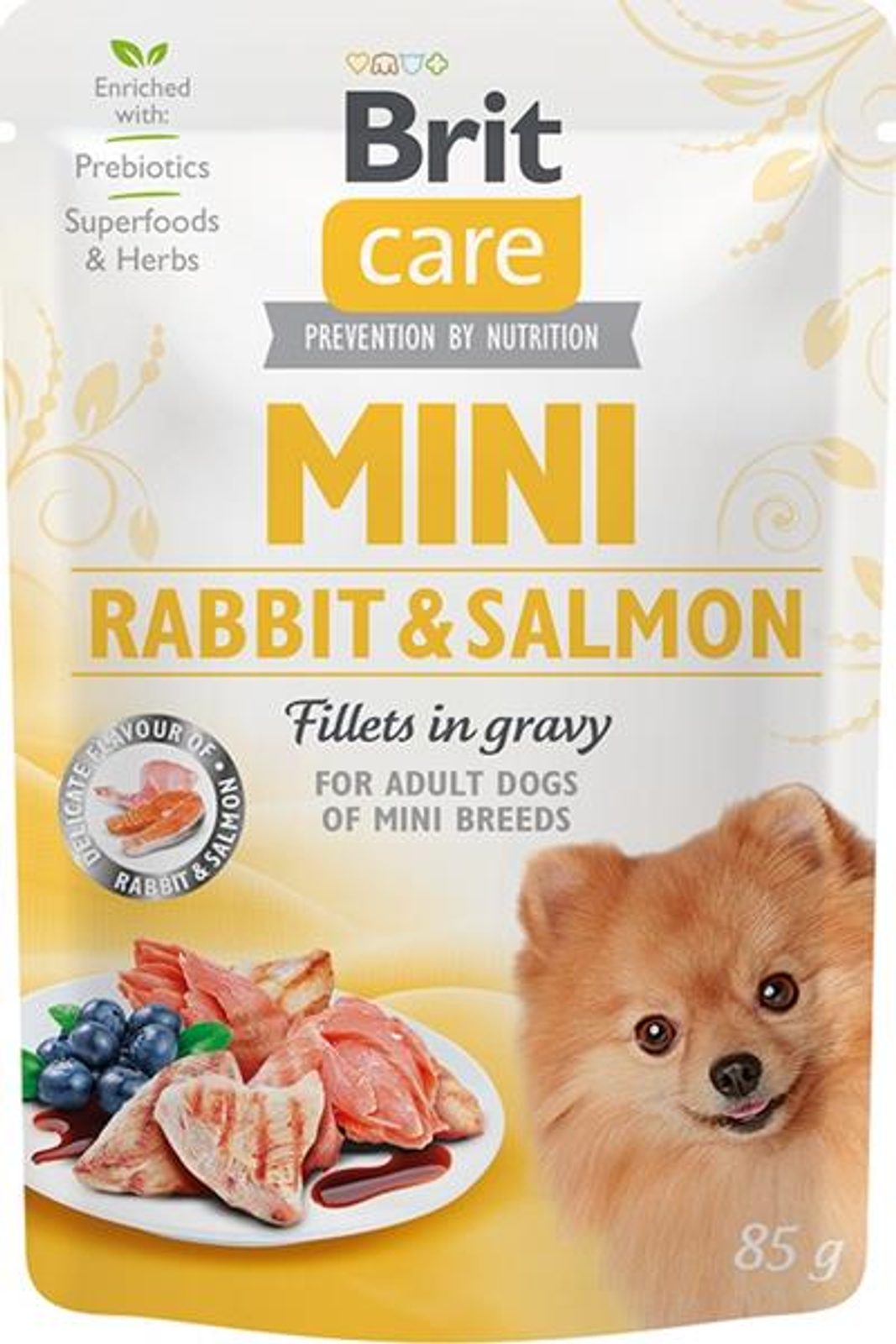 Brit Care Mini Dog kaps. Rabbit&Salmon fillets in gravy 85 g Brit Care Mini Dog kaps. Rabbit&Salmon fillets in gravy 85 g Jemné filetky s králíkem a lososem v omáčce. Toto krmivo pro malé psy je díky čerstvým proteinům lehce stravitelné a velmi chutné. Přírodní aditiva pro podporu imunity působí u malých pejsků jako prevence. Nízký glykemický index krmiva pomáhá předcházet vzniku obezity a přispívá k nižší zátěži trávicího traktu a ke stabilizaci hladiny krevního cukru. V kostce: cíleno na specifické potřeby mini psů, prebiotika pro lepší trávení, podpora imunity a kondice. Hlavní přednosti: velmi chutné, obohaceno o prebiotika pro dobré trávení, obsahuje rozmarýn, kurkumu, hřebíček, citrusy a borůvky, velmi vhodné pro vybíravé pejsky, vyrobeno v České republice. Složení: 45 % maso a vedlejší výrobky živočišného původu ve filetech (4 % králík), 35 % ryby a výrobky rybího původu ve filetech (4 % losos), 9,6 % masová šťáva, 1,5 % byliny a ovoce (hřebíček, citrusy, rozmarýn, kurkuma), 0,5 % borůvky, 1 % minerály, 1 % lososový olej, 0,5 % mannan-oligosacharidy, 0,5 % frukto-oligosacharidy, 0,4 % inulin. Analytické složky: hrubý protein 9 %, hrubé oleje a tuky 4 %, hrubý popel 2,1 %, hrubá vláknina 0,4 %, vlhkost 82 %, vápník 0,3 %, fosfor 0,2 %, sodík 0,5 %. Nutriční doplňkové látka na 1 kg: vitamín D3 (E671) 250 m.j., vitamín E (3a700) 100 mg, zinek (3b606) 15 mg, železo (3b103) 10 mg, mangan (3b502) 3 mg, jód (3b201) 0,75 mg, měď (E4) 0,5 mg, biotin (3a880) 0,2 mg. Bez umělých aromat. Bez konzervantů. Metabolizovatelná energie: 820 kcal/kg Krmný návod: Hmotnost psa Denní dávka 2–5 kg 2–3,5 ks 5–10 kg 3,5–6 ks Údaje uvedené v tabulce jsou pouze orientační. Krmnou dávku upravujte dle individuálních potřeb zvířete a dbejte, aby mělo neustále k dispozici čerstvou pitnou vodu.