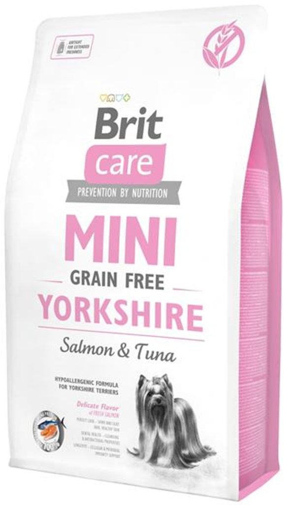Brit Care Mini Dog Yorkshire 2 kg Brit Care Mini Dog Yorkshire 0,4 kg Superprémiové hypoalergenní krmivo zaměřené na specifické potřeby malých plemen s lososem a tuňákem. Krmivo pro malé psy, jehož klíčovými benefity jsou stravitelnost a chutnost díky čerstvým proteinům. Hlavní je přístup prevence s výživou, který v případě malých pejsků znamená soubor přírodních aditiv pro podporu imunity. Je rovněž zajištěn nízký glykemický index krmiva, prevence obezity, nižší zátěž trávicího traktu a stabilizace hladiny krevního cukru. V kostce: zcela bez obilovin, péče o srst, podpora dlouhověkosti, ochrana zubů. Malá plemena mají specifické nároky na výživu. Vhledem k malému vzrůstu se pohybují v prostředí s vysokou koncentrací prachu a škodlivin. To s sebou přináší vyšší hladinu stresu a extrémní zátěž pro vnější i vnitřní ochranné bariéry organismu – srst, kůži, slizniční imunitu a buněčnou obranyschopnost. Specifická anatomie – krátký trávicí trakt a rychlé zažívání oproti velkým psům – vyžaduje přísun vysoké koncentrace živin v malé krmné dávce. Hlavní přednosti: antistresový faktor a zdraví srdce – kardiovaskulární zdraví, borůvky – zdroj polyfenolu a flavonoidu, podpora buněčné a mikrobiální identity – rakytník, vitamín C, prebiotika, MOS, FOS, inulin, zdraví a antibakteriální ochrana zubů – čistící účinky v oblasti zubů dásní – hřebíček, šalvěj, vyrobeno v České republice. Složení: sušený losos (20 %), bílkoviny z čerstvého lososa (15 %), sušený tuňák (15 %), žlutý hrách, kuřecí tuk (konzervovaný tokoferoly), cizrna, lněné semeno (5 %), pohanka, lososový olej (3 %), sušená jablka, pivovarské kvasnice, řasy (0,5 %, Ascophyllum nodosum), hydrolyzované ulity korýšů (zdroj glukosaminu, 260 mg/kg), borůvky (230 mg/kg, zdroj polyfenolů 70 mg/kg & flavonoidy 30 mg/kg), výtažek z chrupavek (zdroj chondroitinu, 160 mg/kg), mannan-oligosacharidy (150 mg/kg), byliny a ovoce (rozmarýn, citrusy, kurkuma, 150 mg/kg), frukto-oligosacharidy (100 mg/kg), Yucca schidigera (100 mg/kg), inulin (90 mg/kg), ostropestřec (75 mg/kg), rakytník (75 mg/kg), heřmánek (30 mg/kg), hřebíček (30 mg/kg), šalvěj (25 mg/kg). Analytické složky: hrubý protein 30 %, hrubé oleje a tuky 19 %, vlhkost 10 %, hrubý popel 8,4 %, hrubá vláknina 2,8 %, vápník 1,4 %, fosfor 1,1 %, omega-3 mastných kyselin 2,3 %, omega-6 mastných kyselin 2,7 %. Nutriční doplňkové látky na 1 kg: vitamín A (3a672a) 20 000 m.j.; vitamín D3 (E671) 1 500 m.j.; vitamín E (?-tokoferol) (3a700) 500 mg; vitamin C (3a312) 300 mg; cholinchlorid (3a890) 700 mg; taurin (3a370) 200 mg; biotin (3a880) 3 mg; vitamín B1 (3a821) 1 mg; vitamín B2 4 mg; niacinamid (3a315) 12 mg; D-pantothenan vápenatý (3a841) 10 mg; vitamín B6 (3a831) 1 mg; kyselina listová (3a316) 0,5 mg; vitamín B12 0,04 mg; chelát zinku aminokyselin hydrát 100 mg; monohydrát síranu železnatého 80 mg; oxid manganatý 40 mg; jodid draselný 0,75 mg; chelát mědi aminokyselin hydrát 15 mg; organická forma selenu, kterou produkují Saccharomyces cerevisiae CNCM I-3060 0,2 mg. Metabolizovatelná energie: 3 910 kcal/kg. Dávkování: Doporučená denní krmná dávka hmotnost psa množství 1 kg 30 g 2 kg 40 g 4 kg 55 g 5 kg 70 g Miniaturní plemena mají vyšší energetické nároky a poměrně malý objem trávicího traktu a žaludku. Proto je třeba doporučený denní přísun potravy uvedený v tabulce krmení rozdělit na 2 až 3 stejné porce podávané v průběhu dne. Podávejte suché nebo mírně navlhčené teplou vodou. Při prvním podání krmiva Brit Care smíchejte s předchozím krmivem a postupně zvyšujte podíl krmiva Brit Care v průběhu 7 dnů. Denní množství může být různé podle prostředí, míry aktivity a věku psa. Zajistěte, aby pes měl vždy k dispozici čerstvou pitnou vodu.