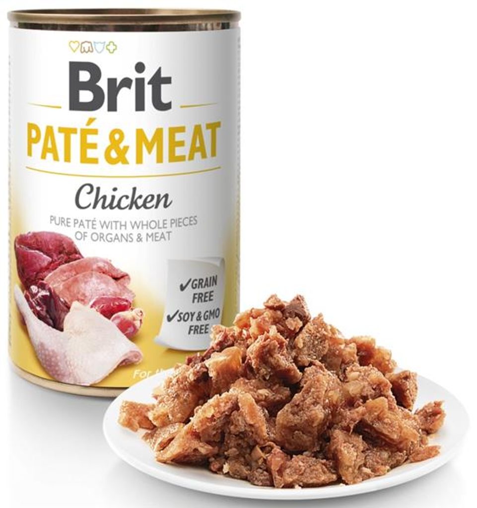 Brit Paté & Meat konz. Chicken 400 g Brit Paté & Meat konz. Chicken 400 g 70 % kuře a hovězí, čisté masové paté s celými kousky vnitřností a masa. Vysoký podíl kvalitního masa a jeho šetrné zpracování je zárukou excelentní chuti i vůně. Lahodná kombinace skutečných masových kousků a orgánového masa v paté dokonale uspokojí i ty nejnáročnější psí gurmány. V kostce: skutečné kousky masa a vnitřností v paté, šetrné zpracování – excelentní chuť, bez obilovin, bez sóji, bez GMO. Hlavní přednosti: skutečné kousky masa s celými kousky vnitřností v paté – záruka výborné chuti i vůně, Ideální doplněk ke granulím, pomáhá zlepšit příjem krmiva a doplnit tekutiny, lososový olej, zdroj omega-3 mastné kyseliny – přispívá ke kvalitě pokožky a srsti. Složení: 48 % kuře (maso a vnitřnosti), 22 % hovězí (maso a vnitřnosti), 3 % hrachový škrob, 1 % hrachová vláknina, 0,5 % lososový olej. Analytické složky: hrubý protein 8 %, hrubé oleje a tuky 5 %, hrubý popel 3,5 %, vlhkost 78 %, hrubá vláknina 0,5 %, vápník 0,1 %, fosfor 0,3 %, sodík 0,2 %. Nutriční doplňkové látky na 1 kg: vitamín D3 (3a671) 250 m.j., vitamín E (3a700) 100 mg, zinek (3b606) 15 mg, železo (3b106) 10 mg, mangan (3b504) 3 mg, jodid draselný (3b201) 0,75 mg, měď (3b406) 0,5 mg, biotin (3a880) 0,2 mg. Technologická aditiva v 1 kg: karubin (E410) 5 000 mg. Metabolizovatelná energie: 959 kcal/kg Krmný návod: Denní dávka: Hmotnost psa Jako kompletní krmivo Jako doplňkové krmivo 1–10 kg 100–200 g 50–100 g 10–25 kg 200–400 g 100–200 g 25–45 kg 400–800 g 200–400 g 45–90 kg 800–1 200 g 400–600 g Údaje uvedené v tabulce jsou pouze orientační. Krmnou dávku upravujte dle individuálních potřeb zvířete a dbejte, aby mělo neustále k dispozici čerstvou pitnou vodu.