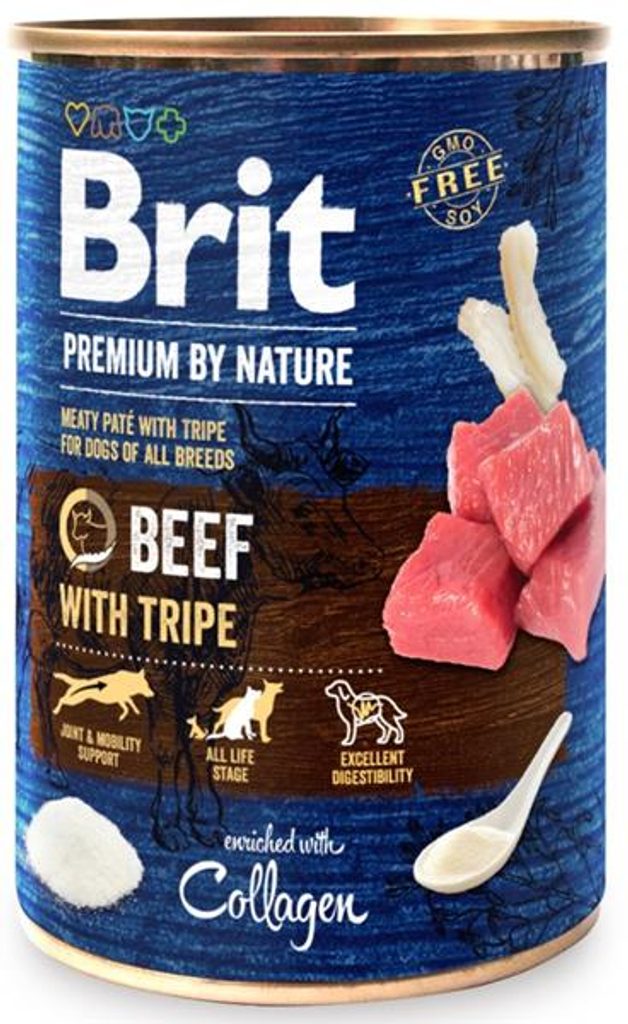 Brit Premium by Nature Dog konz. - Beef with Tripes 400 g Brit Premium by Nature Dog konz. - Beef with Tripes 400 g Kompletní krmivo pro dospělé psy všech plemen může sloužit i jako svačinka nebo dochucení granulí. Mladším pejskům zpestří jídelníček a pochutnají si i ti nejstarší, kteří často mívají problémy se zuby. Masové paté obsahuje vybrané druhy masa s přídavkem bylin, ovoce a kolagenu, navíc je obohaceno o lososový olej (zdroj omega-3 mastných kyselin) a ovoce s bylinkami. Pomáhá zlepšit příjem krmiva a doplnit tekutiny. V kostce: výborná stravitelnost a chuť, vybalancované množství živin, vitamínů a minerálů, bez obilovin, bez sóji, bez GMO, zdroj omega-3 mastných kyselin. Hlavní přednosti: hovězí maso s dršťkami (hovězí 36 %, hovězí vývar 35,5 %, kuře 22 %, dršťky 4 %), obohaceno o kolagen pro zdravé klouby, přidaný lososový olej – zdroj omega-3 mastných kyselin. Složení: hovězí (36 %), kuře (22 %), dršťky (4 %), kolagen (1 %), hrachová mouka, lignocelulóza, lososový olej (0,5 %). Analytické složky: hrubý protein 9 %, hrubé oleje a tuky 6,5 %, hrubá vláknina 0,4 %, hrubý popel 2,7 %, vlhkost 78 %, vápník 0,3 %, fosfor 0,3 %, sodík 0,5 %. Nutriční doplňkové látky na 1 kg: vitamín A (3a672a) 800 m.j., vitamín D3 (3a671) 200 m.j., vitamín E (3a700) 100 mg, vitamín B1 (3a821) 1,3 mg, biotin (3a880) 0,5 mg, zinek (3b606) 10 mg, železo (3b106) 8 mg, mangan (3b504) 2 mg, jód (3b201) 0,5 mg. Metabolizovatelná energie: 1 065 kcal/kg Krmný návod: Hmotnost psa 100 % krmné dávky 50 % krmné dávky 25 % krmné dávky 1–10 kg 200–400 g 100–200 g 50–100 g 10–25 kg 400–800 g 200–400 g 100–200 g 25–50 kg 800–1 200 g 400–600 g 200–300 g 50–70 kg 1 200–1 600 g 600–800 g 300–400 g Údaje uvedené v tabulce jsou pouze orientační. Krmnou dávku upravujte dle individuálních potřeb zvířete a dbejte, aby mělo neustále k dispozici čerstvou pitnou vodu.