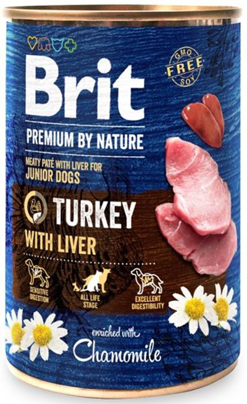 Brit Premium by Nature Dog konz. - Turkey with Liver 400 g Brit Premium by Nature Dog konz. - Turkey with Liver 400 g Masové paté s krůtími játry je ideální doplněk ke granulím pro mladé psy všech velikostí i plemen. Kompletní krmivo pro dospělé psy všech plemen může sloužit i jako svačinka nebo dochucení granulí. Mladším pejskům zpestří jídelníček a pochutnají si i ti nejstarší, kteří často mívají problémy se zuby. Masové paté obsahuje vybrané druhy masa s přídavkem bylin, ovoce a kolagenu, navíc je obohaceno o lososový olej (zdroj omega-3 mastných kyselin) a ovoce s bylinkami. Pomáhá zlepšit příjem krmiva a doplnit tekutiny. výborná stravitelnost a chuť, vybalancované množství živin, vitamínů a minerálů, bez obilovin, bez sóji, bez GMO, zdroj omega-3 mastných kyselin, zklidňující heřmánek. Hlavní přednosti: krůta s játry (krůta 36 %, krůtí vývar 35,5 %, kuře 22 %, krůtí játra 4 %), obohaceno o heřmánek (1 %), který zklidňuje a má vliv i na citlivé zažívání, přidaný lososový olej – zdroj omega-3 mastných kyselin. Složení: krůta (36 %), kuře (22 %), krůtí játra (4 %), sušený heřmánek (1 %), hrachová mouka, lignocelulóza, lososový olej (0,5 %). Analytické složky: hrubý protein 8 %, hrubé oleje a tuky 5,5 %, hrubá vláknina 0,4 %, hrubý popel 2,8 %, vlhkost 78 %, vápník 0,3 %, fosfor 0,3 %, sodík 0,5 %. Nutriční doplňkové látky na 1 kg: vitamín A (3a672a) 800 m.j., vitamín D3 (3a671) 200 m.j., vitamín E (3a700) 100 mg, vitamín B1 (3a821) 1,3 mg, biotin (3a880) 0,5 mg, zinek (3b606) 10 mg, železo (3b106) 8 mg, mangan (3b504) 2 mg, jód (3b201) 0,5 mg, taurin (3a370) 1 000 mg. Metabolizovatelná energie: 1 010 kcal/kg Krmný návod: Hmotnost psa 100 % krmné dávky 50 % krmné dávky 25 % krmné dávky 1–10 kg 200–400 g 100–200 g 50–100 g 10–25 kg 400–800 g 200–400 g 100–200 g 25–50 kg 800–1 200 g 400–600 g 200–300 g 50–70 kg 1 200–1 600 g 600–800 g 300–400 g Údaje uvedené v tabulce jsou pouze orientační. Krmnou dávku upravujte dle individuálních potřeb zvířete a dbejte, aby mělo neustále k dispozici čerstvou pitnou vodu.