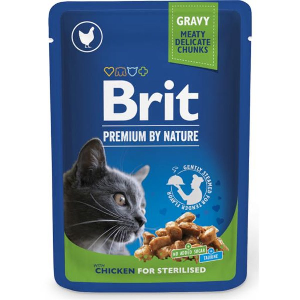 Brit premium Cat kaps. Chicken for Sterilized 100g Brit Care Cat kaps. - Chicken Slices for Steril. 100 g Varianty příchutí respektují přirozené preference koček i jejich nutriční potřeby z hlediska fáze věku či speciální výživy. Delikátní šťáva podtrhuje chuť masových kousků a dodá kočce potřebné tekutiny. Hlavní přednosti krmiva: bez přidaného cukru, výborná chuť, obsahuje taurin, bez barviv, bez konzervantů. Složení: maso a vedlejší výrobky živočišného původu v kouskách 80 % (kuře 8 %), vedlejší výrobky rostlinného původu (inulin 0,4 %), minerální látky. Analytické složky: hrubý protein 8,5 %, hrubé oleje a tuky 3 %, hrubý popel 2,5 %, hrubá vláknina 1 %, vlhkost 82 %. Nutriční doplňkové látky v 1 kg: vitamin D3 (E671) 250 m.j., vitamin E (?-tocopherol) (3a700) 100 mg, zinek (3b606) 10 mg, mangan (E5) 2 mg, jod (3b201) 0,7 mg, měď (E4) 0,2 mg, taurin (3a370) 450 mg, biotin 0,1 mg.