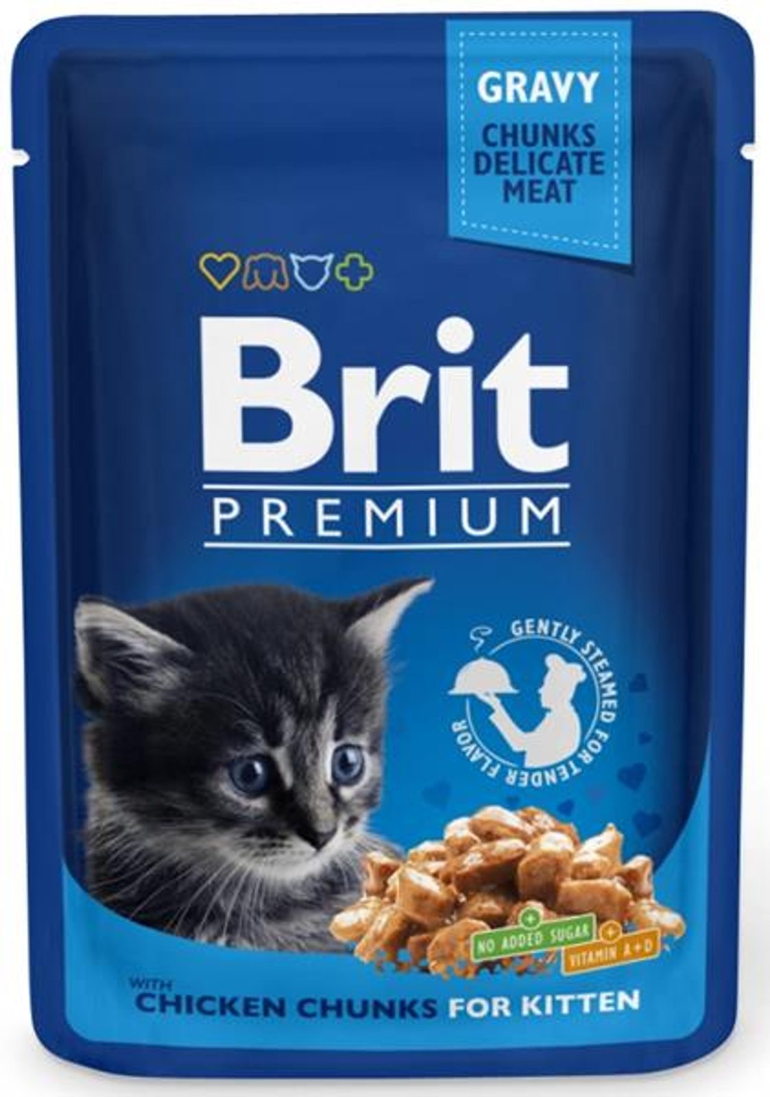Brit Premium Cat kaps. -Gravy Chicken Chunks for Kitten 100 g Brit Care Cat kaps. - Chicken Chunks for Kitten 100 g Varianty příchutí respektují přirozené preference koček i jejich nutriční potřeby z hlediska fáze věku či speciální výživy. Delikátní šťáva podtrhuje chuť masových kousků a dodá kočce potřebné tekutiny. Hlavní přednosti krmiva: bez přidaného cukru, výborná chuť, obsahuje taurin, bez barviv, bez konzervantů. Složení: maso a vedlejší výrobky živočišného původu v kouskách 80 % (kuře 8 %), ryby a vedlejší výrobky z ryb, vedlejší výrobky rostlinného původu, minerální látky. Analytické složky: hrubý protein 9,5 %, hrubé oleje a tuky 5 %, hrubý popel 2,5 %, hrubá vláknina 0,4 %, vlhkost 81 %. Nutriční doplňkové látky v 1 kg: vitamin D3 (E671) 250 m.j., vitamin E (?-tocopherol) (3a700) 100 mg, zinek (3b606) 10 mg, mangan (E5) 2 mg, jod (3b201) 0,7 mg, měď (E4) 0,2 mg, taurin (3a370) 450 mg, biotin 0,1mg.