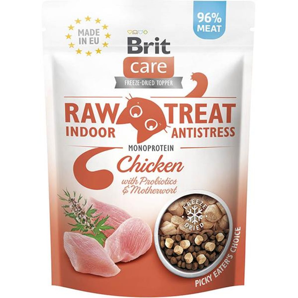 Brit RAW Treat Cat Indoor&Antistress, 40 g Brit RAW Treat Cat Indoor&Antistress, 40 g Doplňkové krmivo vhodné pro kočky žijící v bytě obsahuje 96 % čerstvého masa, které je zdrojem vysoce kvalitních bílkovin nezbytných pro kočičí zdraví. Mrazem sušené (lyofilizované) monoproteinové pamlsky lze použít i jako lahodný doplněk granulí, který promění běžné krmení v neodolatelný zážitek. Hlavní výhody pamlsků: proces sušení mrazem zesiluje chutnost, texturu a aroma, přírodní složení bez obilovin, umělých konzervantů, barviv a přidané soli, monoprotein – pouze jeden druh masa snižuje riziko alergie, obsahují inaktivovaný Lactobacillus na podporu imunity, vyrobeny v EU. Pamlsky obsahují: hydrolyzované kvasnice – poskytují esenciální živiny a udržují zdravá střeva, probiotika – podporují celkovou imunitu a zdraví střev, srdečník – svými zklidňujícími účinky napomáhá zmírnit stres a úzkost. Složení: čerstvé kuřecí odřezky 96?%, lignocelulóza 2?%, sušený srdečník 0,5?%, hydrolyzované kvasnice 0,5?% (zdroj inositolu a aminokyselin), inaktivované bakterie a jejich části Lactobacillus helveticus HA–122 (15 × 109 buněk/kg). Analytické složky: hrubý protein 43 %, hrubé oleje a tuky 37 %, hrubá vláknina 2,5 %, hrubý popel 10 %, vlhkost 4 %, vápník 3 %, fosfor 2 %, sodík 1 %. Přírodní antioxidanty: tokoferolové extrakty z rostlinných olejů, askorbyl palmitát. Konzervanty schválené EU: kyselina citrónová Metabolizovatelná energie: 4 960 kcal/kg Krmný návod: Lyofilizované pamlsky jsou sestaveny tak, aby kompletní a vyváženou stravu doplňovaly, nikoli nahrazovaly. Podávejte cca 2 ks na 1 kg hmotnosti kočky, nepřekračujte ovšem 10 % denního příjmu potravy kočky. Pokud jsou pamlsky pro vaši kočku příliš velké, před podáváním je rozdrobte. Jako topper rozdrobte 5–10 pamlsků na běžné jídlo kočky. Zajistěte, aby zvíře mělo vždy dostatek čerstvé pitné vody.
