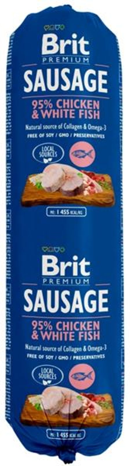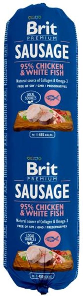 Brit salám Sausage Chicken & White Fish 800 g Brit salám Sausage Chicken & White Fish 800 g Jedinečná kombinace skutečných kousků masa a lehkého, výtečného paté. Lahodné krmivo obsahuje vysoký procentuální podíl masa s obsahem bílé ryby a rýže. Bílá ryba je vyváženým zdrojem omega-3 polynenasycených mastných kyselin, které mají pozitivní vliv na kvalitu psí srsti. Vysoký obsah masa (95 %) zajišťuje skvělou chuť a výbornou stravitelnost. Široká škála rozmanitých chutí nabízí příjemné zpestření psího jídelníčku a je vhodným doplňkem ke granulím BARF i vařenému masu. V kostce: 95 % masa s droby, zdroj omega-3 mastných kyselin, zdraví kůže a srsti. Složení: 87 % kuře (kuřecí maso, játra, srdce, krky, žaludky), 8 % bílé ryby, 3,6 % rýže, 0,9 % vývar, 0,5 % kolagen. Analytické složky: vlhkost 68 %, hrubý protein 12 %, hrubé oleje a tuky 9,5 %, hrubý popel 6,5 %, hrubá vláknina 0,4 %. Nutriční doplňkové látky na 1 kg: vitamín D3 (E671) 250 m.j., vitamín E (3a700) 100 mg, zinek (3b606) 12 mg, železo (E1) 10 mg, mangan (E5) 2 mg, jod (3b201) 0,7 mg, měď (E4) 0,5 mg, biotin (3a880) 0,2 mg. Metabolizovatelná energie: 1 455 kcal/kg Krmný návod: Hmotnost psa 100 % krmné dávky 50 % krmné dávky 5 kg 200 g 100 g 10 kg 300 g 150 g 15 kg 430 g 215 g 20 kg 550 g 275 g > 30 kg 800–1 500 g 400–750 g Údaje uvedené v tabulce jsou pouze orientační. Krmnou dávku upravujte dle individuálních potřeb zvířete a dbejte, aby mělo neustále k dispozici čerstvou pitnou vodu.