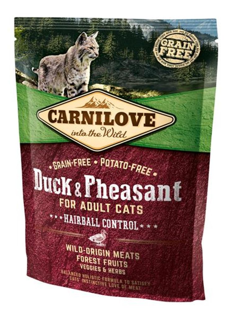Carnilove Cat Adult Duck & Pheasant Grain Free 0,4 kg Carnilove Cat Adult Duck & Pheasant Grain Free 0,4 kg Receptura byla navržena s respektem k přirozené skladbě potravy koček. Poskytuje ideální kombinaci chutných a stravitelných složek potravy s vysokým obsahem přirozených živin pro zlepšení metabolismu a perfektní kondici. Hlavní přednosti krmiva: vysoký podíl masa z divokých zvířat, bohatý zdroj omega-3 mastných kyselin, vysoký obsah vlákniny, prevence tvorby chlupových chomáčků, zelenina, byliny, lesní ovoce, bez obilovin a brambor, bez chemikálií, konzervantů a barviv. Složení: dehydratované kachní maso (34 %), dehydratované bažantí maso (25 %), žlutý hrách (12 %), kuřecí tuk (chráněno tokoferoly, 6 %), řepné řízky (5 %), čerstvá kachna (5 %), kuřecí játra (3 %), tapiokový škrob (2 %), jablka (2 %), lososový olej (2 %), mrkev (1 %), lněné semínko (1 %), cizrna (1 %), hydrolyzované skořápky korýšů (zdroj glukosaminu, 0,026 %), extrakt z chrupavek (zdroj chondroitinu, 0,016 %), pivovarské kvasnice (zdroj mannan-oligosacharidů, 0,016 %), kořen z čekanky (zdroj frukto-oligosacharidů, 0,012 %), juka schidigera (0,01 %), mořská řasa (0,01 %), psyllium (0,01 %), tymián (0,01 %), rozmarýn (0,01 %), oregano (0,01 %), brusinky (0,0008 %), borůvky (0,0008 %), maliny (0,0008 %). Analytické složky: hrubý protein 40 %, hrubé oleje a tuky 18 %, hrubá vláknina 5 %, hrubý popel 7,8 %, vlhkost 10 %, vápník 1,4 %, fosfor 1,1 %, sodík 0,3 %, hořčík 0,08 %. Nutriční doplňkové látky v 1 kg: vitamín A (E672) 23 000 m.j., vitamín D3 (E671) 940 m.j., vitamín E (3a700) 650 m.j., vitamín C (E300) 300 mg, taurin 2 400 mg, cholinchlorid 2 200 mg, L-karnitin 65 mg, niacin 45 mg, biotin 1,8 mg, zinek (E6) 150 mg, mangan (E5) 55 mg, železo (E1) 48 mg, měď (E4) 11 mg, jód (E2) 3,8 mg, selen (E8) 0,23 mg, DL-methionin (3.1.1.) 14 mg, arginin (3c3.6.1) 12 mg, L-lysin (3.2.3.) 10 mg. Metabolizovatelná energie: 3 800 kcal/kg omega-3: 0,33 %, omega-6: 2,28 %. Krmný návod: Hmotnost kočky Denní dávka 2–3 kg 40–55 g 3–5 kg 55–75 g 5–7 kg 75–85 g 5–7 kg 85–100 g Údaje uvedené v tabulce jsou pouze orientační. Krmnou dávku upravujte dle individuálních potřeb zvířete. Zvíře by mělo mít neustále k dispozici čerstvou pitnou vodu.