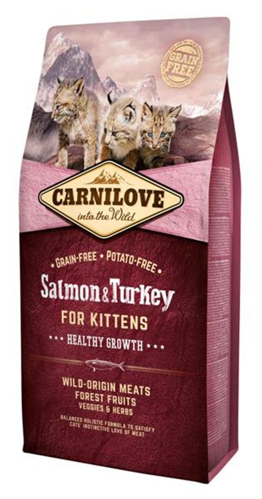 Carnilove Cat Kitten Salmon & Turkey Grain Free 6 kg Carnilove Cat Kitten Salmon & Turkey Grain Free 0,4 kg Receptura byla navržena s respektem k přirozené skladbě potravy koček. Poskytuje kvalitní proteiny, tuky, vitamíny a esenciální živiny potřebné pro zdravý růst a optimální tělesný vývoj koťat. Hlavní přednosti krmiva: vysoký podíl masa z divokých zvířat, bohatý zdroj omega-3 mastných kyselin, komplex výživných látek pro zdravý růst a tělesný vývoj, zelenina, byliny, lesní ovoce, bez obilovin a brambor, bez chemikálií, konzervantů a barviv, hodné pro koťata. Složení: dehydratovaný losos (25 %), dehydratované krůtí maso (24 %), žlutý hrách (18 %), kuřecí tuk (chráněno tokoferoly, 11 %), hydrolyzovaný kuřecí protein (9 %), kuřecí játra (3 %), lososový olej (3 %), tapiokový škrob (2 %), jablka (1 %), mrkev (1 %), lněné semínko (1 %), cizrna (1 %), hydrolyzované skořápky korýšů (zdroj glukosaminu, 0,028 %), extrakt z chrupavek (zdroj chondroitinu, 0,017 %), pivovarské kvasnice (zdroj mannan-oligosacharidů, 0,017 %), kořen z čekanky (zdroj frukto-oligosacharidů, 0,014 %), juka schidigera (0,01 %), mořská řasa (0,01 %), psyllium (0,01 %), tymián (0,01 %), rozmarýn (0,01 %), oregano (0,01 %), brusinky (0,0008 %), borůvky (0,0008 %), maliny (0,0008 %). Analytické složky: hrubý protein 40 %, hrubé oleje a tuky 20 %, hrubá vláknina 2 %, hrubý popel 7,5 %, vlhkost 10 %, vápník 1,3 %, fosfor 1 %, sodík 0,5 %, hořčík 0,08 %. Nutriční doplňkové látky v 1 kg: vitamín A (E672) 25 000 m.j., vitamín D3 (E671) 1 000 m.j., vitamín E (3a700) 750 m.j., vitamín C (E300) 350 mg, taurin 2 500 mg, cholinchlorid 2 300 mg, L-karnitin 70 mg, niacin 50 mg, biotin 2 mg, zinek (E6) 160 mg, mangan (E5) 60 mg, železo (E1) 50 mg, měď (E4) 12 mg, jód (E2) 4 mg, selen (E8) 0,25 mg, DLmethionin (3.1.1.) 15 mg, arginin (3c3.6.1) 13 mg, L-lysin (3.2.3.) 11 mg. Metabolizovatelná energie: 4 150 kcal/kg omega-3: 0,60 %, omega-6: 2,70 %. Krmný návod: Věk kotěte (měsíc) Denní dávka 1–4 měsíce 25–45 g 4–7 měsíců 45–60 g 7–12 měsíců 60–100 g Údaje uvedené v tabulce jsou pouze orientační. Krmnou dávku upravujte dle individuálních potřeb zvířete. Zvíře by mělo mít neustále k dispozici čerstvou pitnou vodu.