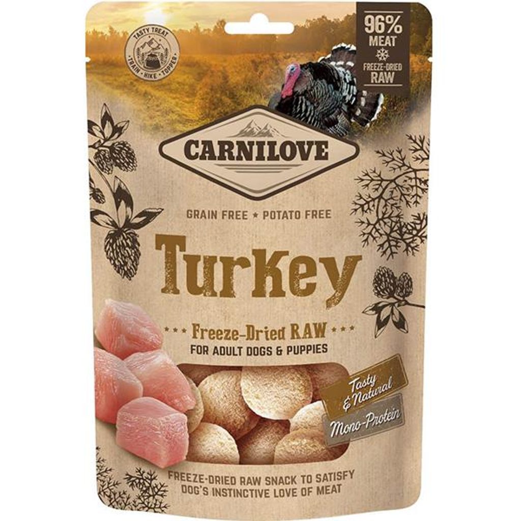 Carnilove Dog Freeze-Dried Raw Snacks Turkey 60 g Carnilove Dog Freeze-Dried Raw Snacks Turkey 60 g Mrazem sušené pamlsky jsou ideální pochoutkou, která vašemu psovi či štěněti poskytne zdravou motivaci a odměnu. Lze je použít i jako topper k dochucení běžného krmiva. Pamlsky s vysokým obsahem bílkovin a tuků jsou zvlášť vhodné pro dospělé aktivní psy a štěňata v růstu. Klíčové vlastnosti lyofilizovaných pamlsků: obsahují 96 % čerstvého masa, monoprotein – vyrobené z jediné masové složky, ideální pro psy s alergiemi, citlivým žaludkem nebo speciálními dietními požadavky, poloměkká struktura ve tvaru penízku – ideální jako tréninkový pamlsek, lehce stravitelné a plné potřebných živin a energie. Složení: čerstvé krůtí odřezky 96 %, lignocelulóza 2 %, hrachová mouka. Analytické složky: hrubý protein 42 %, hrubý tuk 35 %, vlhkost 4 %, hrubý popel 10 %, hrubá vláknina 2,5 %, vápník 3 %, fosfor 2 %, sodík 1 %. Přírodní antioxidanty: tokoferolové extrakty z rostlinných olejů, askorbyl palmitát a výtažek z rozmarýnu. Konzervanty schválené EU: kyselina citrónová Metabolizovatelná energie: 4 880 kcal/kg Krmný návod: Lyofilizované pochoutky slouží jako pamlsek nebo jako topper na suché či mokré krmivo a neměly by nahrazovat kompletní a vyváženou stravu. Podávejte jako součást zdravého jídelníčku vašeho psa. Berte na vědomí, že nutriční hodnota 100 g lyofilizovaného výrobku odpovídá 300 g čerstvého syrového masa. Skladujte v chladu a suchu. Psovi vždy zajistěte dostatek čerstvé pitné vody. Krmná tabulka: hmotnost psa 1–10 kg 10–25 kg 25 a více kg denní dávka jako pamlsek 2 ks 2–4 ks 4 a více ks denní dávka jako topper 5 g 5–10 g 10 a více g