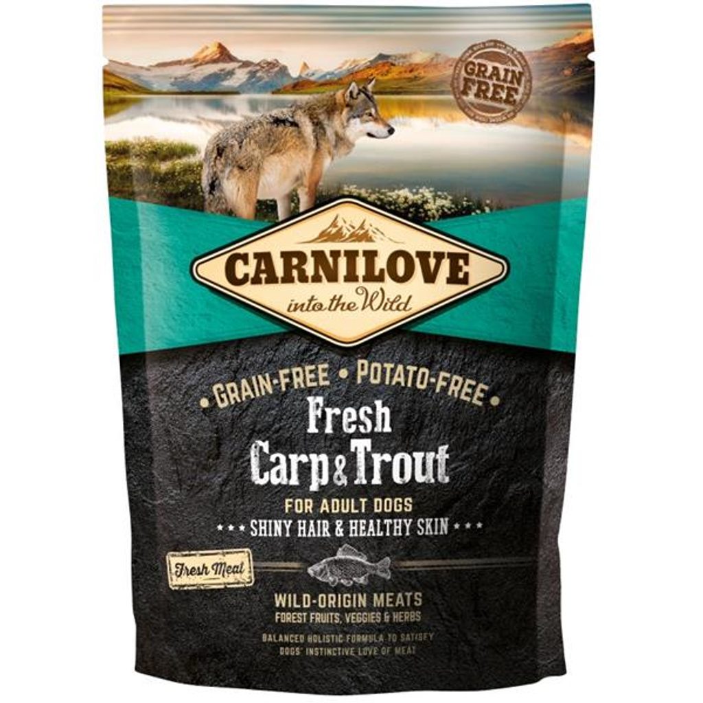 Carnilove Dog Fresh Carp & Trout 1,5kg Carnilove Dog Fresh Carp & Trout 12kg Receptura byla navržena s respektem k zákonům přírody a poskytuje vašemu psímu parťákovi vyváženou stravu bohatou na čerstvou rybu a mořské plody v kombinaci s různými druhy zeleniny, plodů a bylin. Hlavní přednosti: vysoký podíl masa z divokých zvířat, zlepšuje kvalitu a vzhled srsti a kůže, bohatý zdroj omega-3, zelenina, byliny, lesní ovoce, bez obilovin a brambor, bez chemikálií, konzervantů a barviv, vysoká stravitelnost. Složení: čerstvý kapr (26 %), sušený pstruh (18 %), hydrolyzovaný losos (14 %), sušený losos (12 %), dýně, cizrna, hrách, kuřecí tuk (konzervovaný tokoferoly, 5 %), kuřecí játra (3 %), lososový olej (2 %), jablka, mrkev, lněné semínko, hydrolyzované skořápky z korýšů (zdroj glukosaminu, 0,026 %), extrakt chrupavky (zdroj chondroitinu, 0.016 %), pivovarské kvasnice (zdroj mannan-oligosacharidů, 0.015 %), kořen čekanky (zdroj frukto-oligosacharidů, 0.01 %), yucca schidigera (0,01 %), mořské řasy (0,01 %), psyllium (0,01 %), tymián (0,01 %), rozmarýn (0,01 %), oregano (0,01 %), brusinky (0,0008 %), borůvky (0,0008 %), rakytník (0,0008 %), kořen zázvoru (0,0008 %), šalvěj (0,0008 %). Analytické složky: hrubý protein 34 %, obsah tuku 15 %, vlhkost 10 %, hrubý popel 7,2 %, hrubá vláknina 3,5 %, vápník 1 %, fosfor 0,8 %, omega-3 0,8 %, omega-6 1,8 %, EPA (20:5 n-3) 0,1 %, DHA (22:6 n-3) 0,2 %. Nutriční doplňkové látky na 1 kg: vitamín A (3a672a) 20 000 m.j., vitamín D3 (E671) 1 500 m.j., vitamín E (?-tokoferol) (3a700) 400 mg, zinek (3b606) 85 mg,železo (E1) 70 mg, mangan (E5) 35 mg, jód (3b201) 0,65 mg, měď (E4) 15 mg, selen (3b8.10) 0,2 mg. Obsahuje přírodní antioxidanty. Metabolizovatelná energie: 3 730 kcal/kg. Krmný návod: Podávejte suché nebo navlhčené vodou. Denní dávka se bude lišit podle věku, velikosti, výkonu a prostředí. Doporučené denní dávkování je uvedené v krmné tabulce. Pokud podáváte krmivo Carnilove poprvé, v prvním týdnu podávejte smíchané s původním krmivem a postupně navyšujte podíl Carnilove v celkové denní dávce. Nezapomeňte ke krmení vždy připravit miskou s čerstvou pitnou vodou. Spotřebujte do data uvedeného na obalu. Uchovejte v suchém a chladném místě. Hmotnost psa Denní dávka 5 kg 75 g 10 kg 130 g 15 kg 170 g 20 kg 220 g 25 kg 250 g 30 kg 290 g 40 kg 360 g 50 kg 420 g 60 kg 480 g 70 kg 540 g 80 kg 600 g 90 kg 660 g