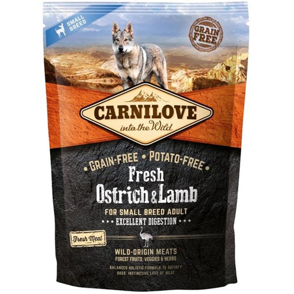 Carnilove Dog Fresh Small B. Ostrich&Lamb 1,5kg Carnilove Dog Fresh Small B. Ostrich&Lamb 6kg Receptura byla navržena s respektem k zákonům přírody a poskytuje vašemu malému psímu parťákovi vyváženou stravu bohatou na čerstvé maso v kombinaci s různými druhy zeleniny, plodů a bylin. Hlavní přednosti: vysoký podíl masa z divokých zvířat, nízký obsah tuku, vysoký podíl bílkovin, zelenina, byliny, lesní ovoce, bez obilovin a brambor, bez chemikálií, konzervantů a barviv, vysoká stravitelnost, vhodné pro psy malých plemen, hypoalergenní. Složení: čerstvý pštros (26 %), sušené jehněčí (20 %), sušená krůta (20 %), kuřecí tuk (konzervovaný tokoferoly, 9 %), dýně, cizrna, hrách, kuřecí játra (3 %), lososový olej (2 %), jablka, mrkev, lněné semínko, hydrolyzované skořápky z korýšů (zdroj glukosaminu, 0,026 %), extrakt chrupavky (zdroj chondroitinu, 0.016 %), pivovarské kvasnice (zdroj mannan-oligosacharidů, 0.015 %), kořen čekanky (zdroj frukto-oligosacharidů, 0.01 %), yucca schidigera (0,01 %),mořské řasy (0,01 %), psyllium (0,01 %), tymián (0,01 %), rozmarýn (0,01 %), oregano (0,01 %), brusinky (0,0008 %), borůvky (0,0008 %), rakytník (0,0008 %), kořen zázvoru (0,0008 %), šalvěj (0,0008 %). Analytické složky: hrubý protein 30 %, obsah tuku 17 %, vlhkost 10 %, hrubý popel 8,2 %, hrubá vláknina 3,5 %, vápník 1,6 %, fosfor 1,3 %, omega-3 0,6 %, omega-6 1,8 %, EPA (20:5 n-3) 0,08 %, DHA (22:6 n-3) 0,1 %. Nutriční doplňkové látky na 1 kg: vitamín A (3a672a) 20 000 m.j., vitamín D3 (E671) 1 500 m.j., vitamín E (?-tokoferol) (3a700) 400 mg, zinek (3b606) 85 mg,železo (E1) 70 mg, mangan (E5) 35 mg, jód (3b201) 0,65 mg, měď (E4) 15 mg, selen (3b8.10) 0,2 mg. Obsahuje přírodní antioxidanty. Metabolizovatelná energie: 3 770 kcal/kg. Krmný návod: Podávejte suché nebo navlhčené vodou. Denní dávka se bude lišit podle věku, velikosti, výkonu a prostředí. Doporučené denní dávkování je uvedené v krmné tabulce. Pokud podáváte krmivo Carnilove poprvé, v prvním týdnu podávejte smíchané s původním krmivem a postupně navyšujte podíl Carnilove v celkové denní dávce. Nezapomeňte ke krmení vždy připravit miskou s čerstvou pitnou vodou. Spotřebujte do data uvedeného na obalu. Uchovejte v suchém a chladném místě. Hmotnost psa Denní dávka 1 kg 30 g 2 kg 40 g 4 kg 55 g 6 kg 75 g 8 kg 110 g 10 kg 130 g