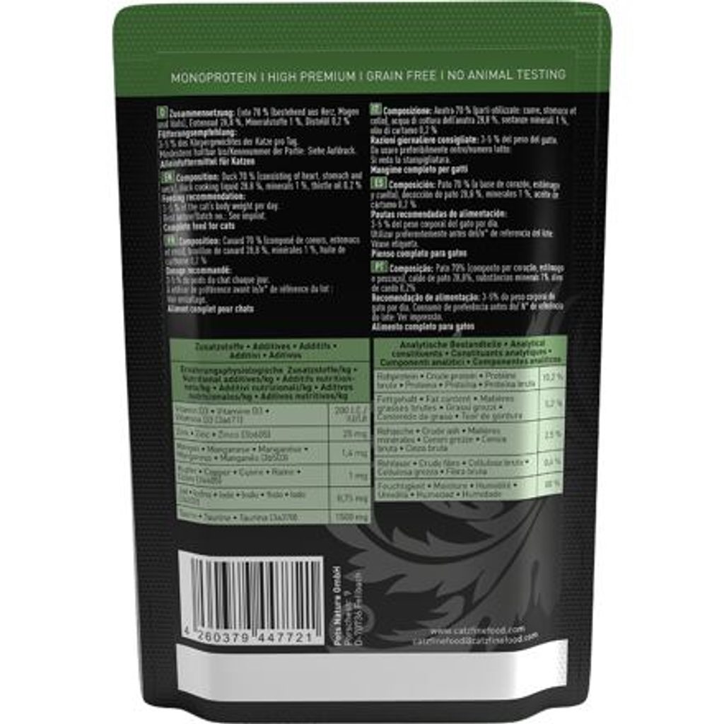 Lahodná monoproteinová kapsička pro kočky, která obsahuje kachní maso, vnitřnosti, vývar, minerální látky a bodlákový olej. Jedná se o kompletní krmivo, vhodné i pro kočky s citlivým zažíváním nebo pro alergické kočky. Excelentní