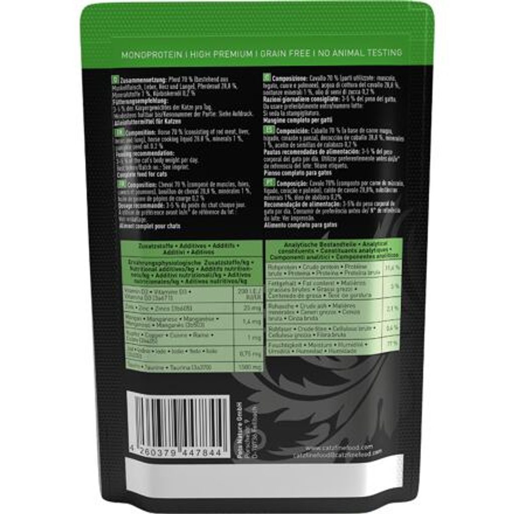 Lahodná monoproteinová kapsička pro kočky, která obsahuje koňské maso, vnitřnosti a vývar, minerální látky a dýňový olej. Jedná se o kompletní krmivo, vhodné i pro kočky s citlivým zažíváním nebo pro alergické kočky. Excelentní