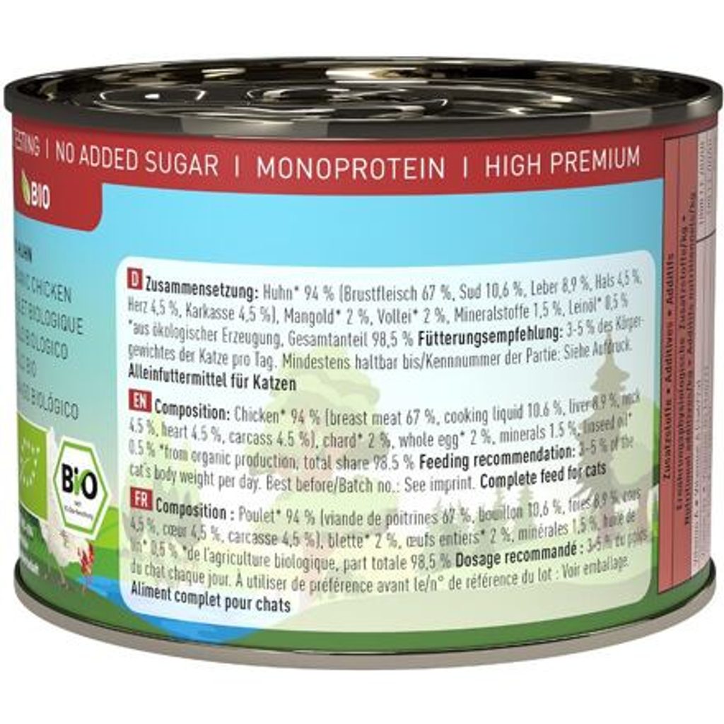 Kompletní monoproteinové krmivo v bio kvalitě. Obsahuje vysoký podíl kuřecího masa, mangold, vejce a zdraví prospěšný lněný olej. Můžete objednávat po 1 kuse. Obchodní balení 6 ks. Kompletní