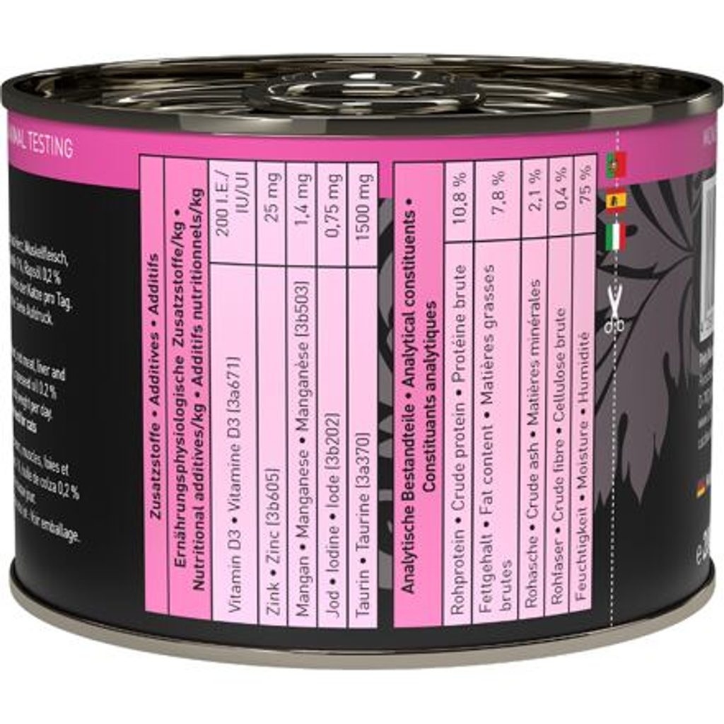 Lahodná monoproteinová konzerva pro kočky, která obsahuje hovězí maso, vnitřnosti, vývar, minerální látky a řepkový olej. Jedná se o kompletní krmivo, vhodné i pro kočky s citlivým zažíváním nebo pro alergické kočky. Excelentní