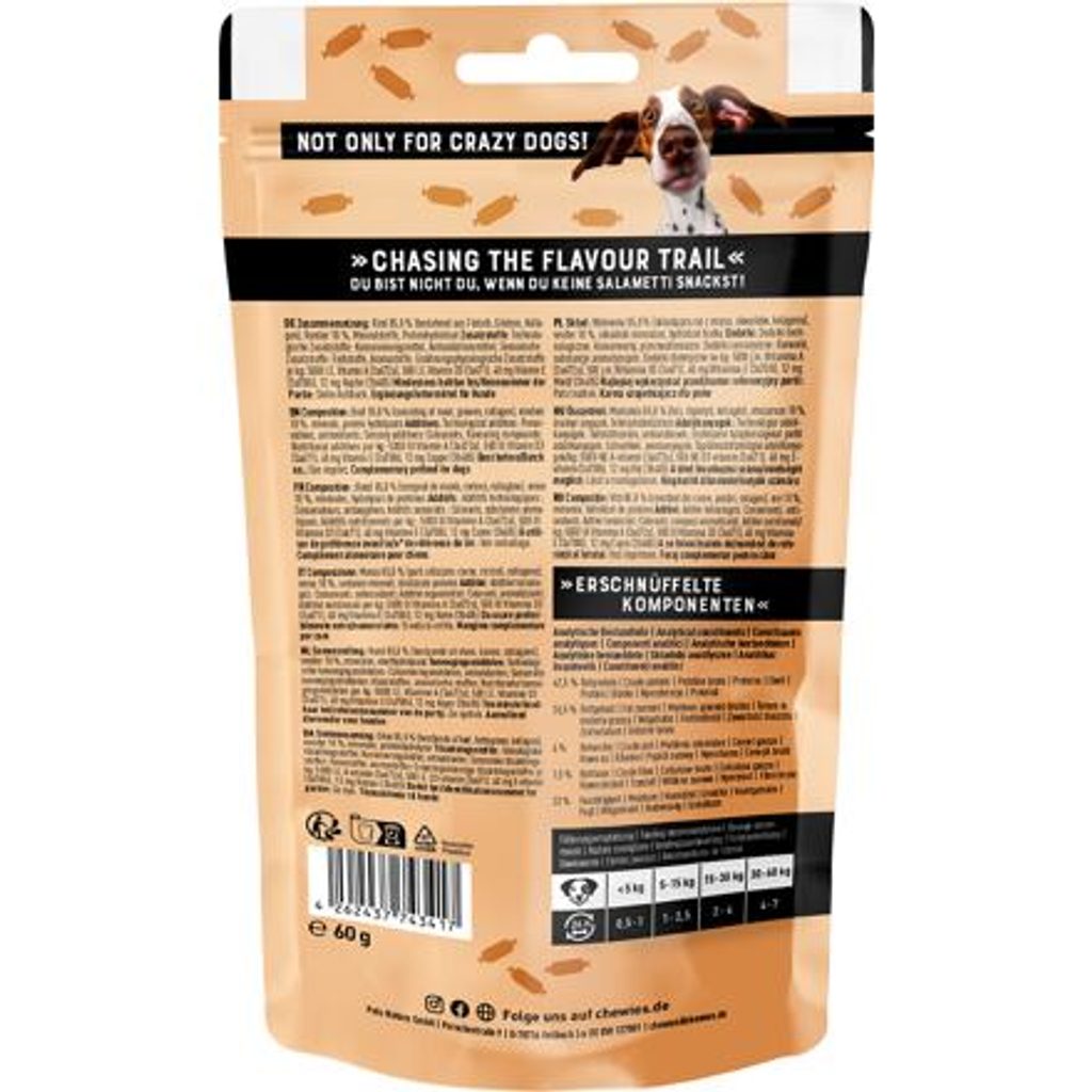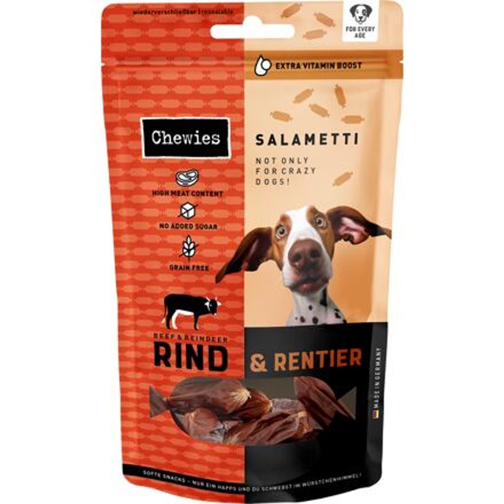 Malé salámky s výraznou chutí a vůní jsou pamlsky pro psy, které se hodí nejen na trénink nebo pro aktivní pejsky. Obsahují velké množství proteinu a kolagen. Přirozeně bez obilovin a přidaného cukru. Salametti