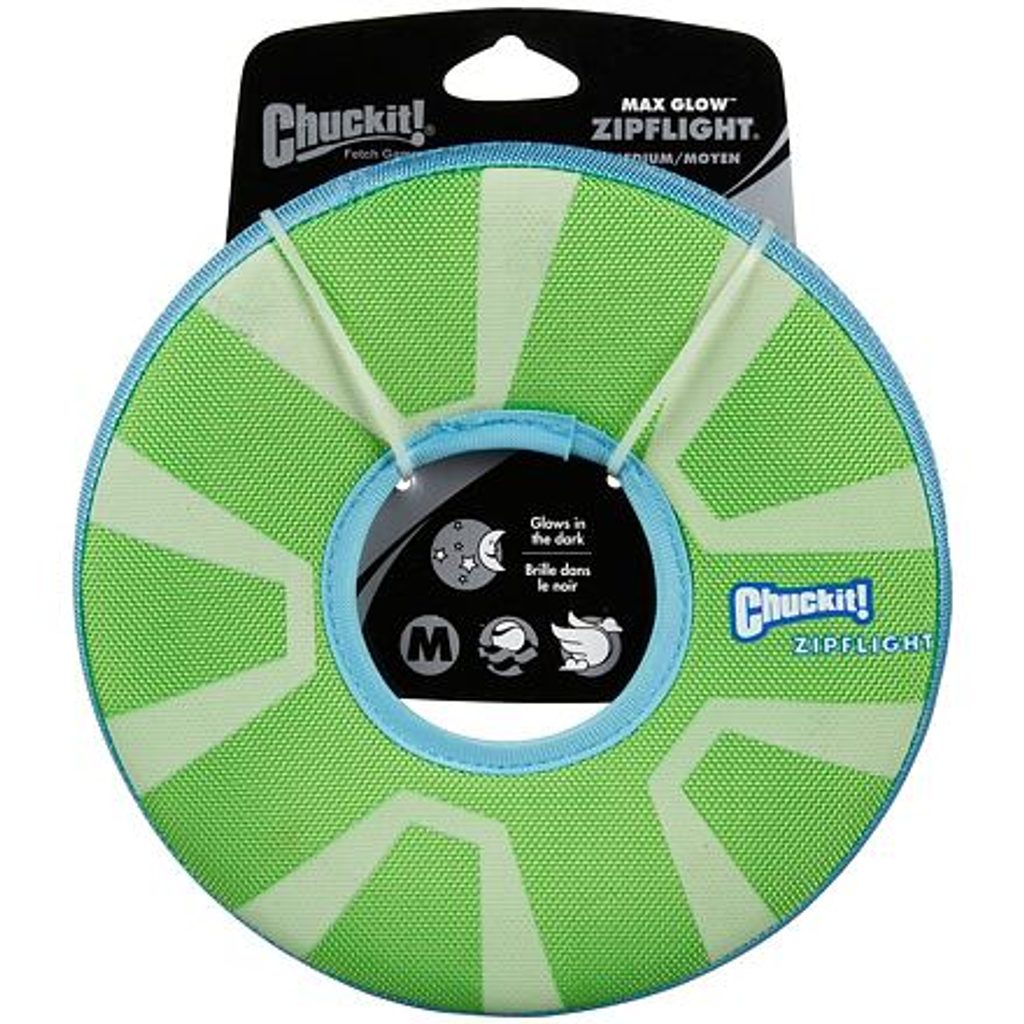 Létající talíř Zipflight Max Glow vhodný k aportování. Ve tmě výrazně svítí. Vyrobený ze svítící gumy, pěnové gumy a nylonu. Obojživelný létající talíř vhodný k aportování.