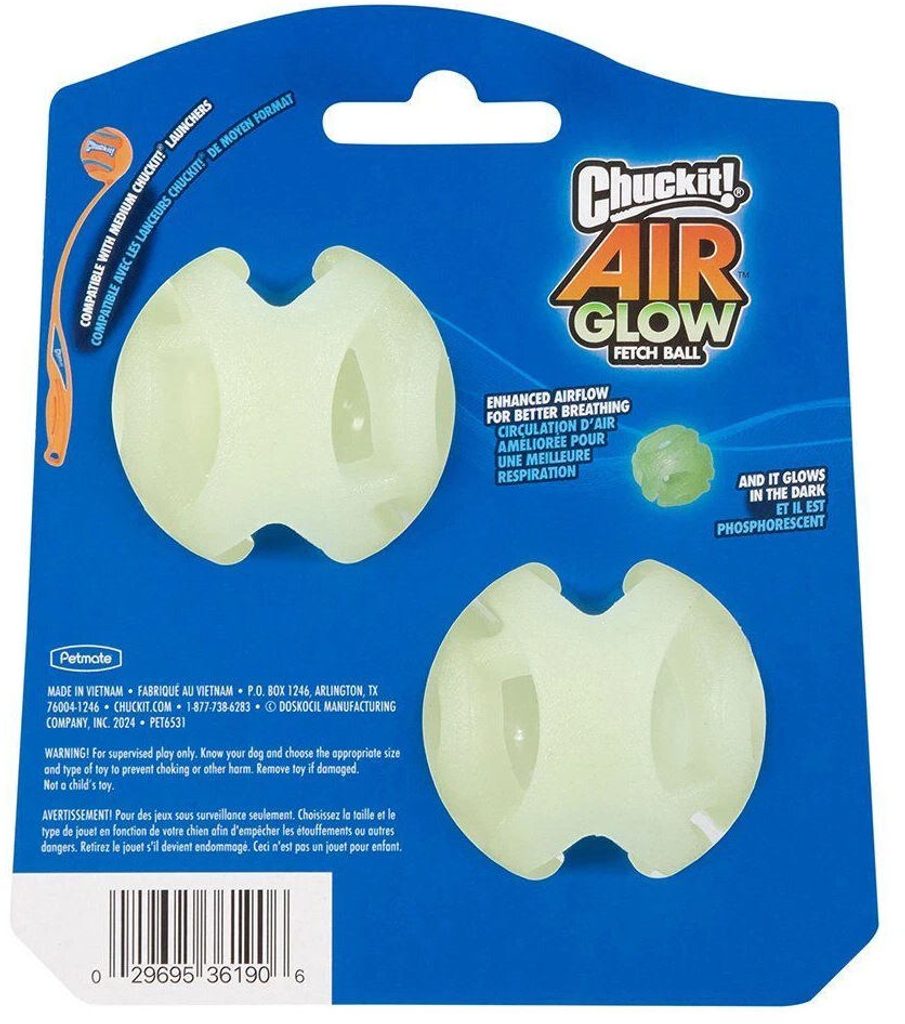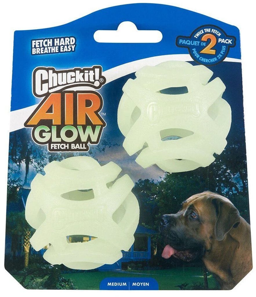 Svítící míčky s otevřenou konstrukcí, která psovi umožňuje užít si i delší hru bez zadýchání. Kompatibilní s házeči Chuckit! Velikost ideální pro středně velké psy. Dva míčky v balení. Míček Air Glow v sobě kombinuje vlastnosti oblíbených svítících míčků Chuckit! společně s lehkou prodyšnou konstrukcí děrovaných míčků Air Fetch. Otevřený design umožňuje psovi přirozeně dýchat i během běhu s míčkem v tlamě, což znamená víc energie, delší aportování a méně zadýchávání. To ocení nejen aktivní psi, ale i třeba plemena s kratším čumákem. Ve tmě jasně svítí – stačí ho na chvíli vystavit dennímu nebo umělému světlu a můžete vyrazit na procházku, klidně i po setmění. Míček skvěle padne do házeče Chuckit!, což znamená delší hody bez námahy, ideální do parku, na louku nebo kamkoli, kde má pes prostor. Průměr velikosti Medium je 6,4 cm – vhodné pro středně velké psy míček ve tmě svítí – stačí krátké „nabíjení“ světlem s otevřenou konstrukcí umožňující správné dýchání během hry odolný, ale zároveň lehký a komfortní pro nošení v tlamě perfektně padne do házečů Chuckit! průměr míčku: 6,4 cm 2 míčky v balení