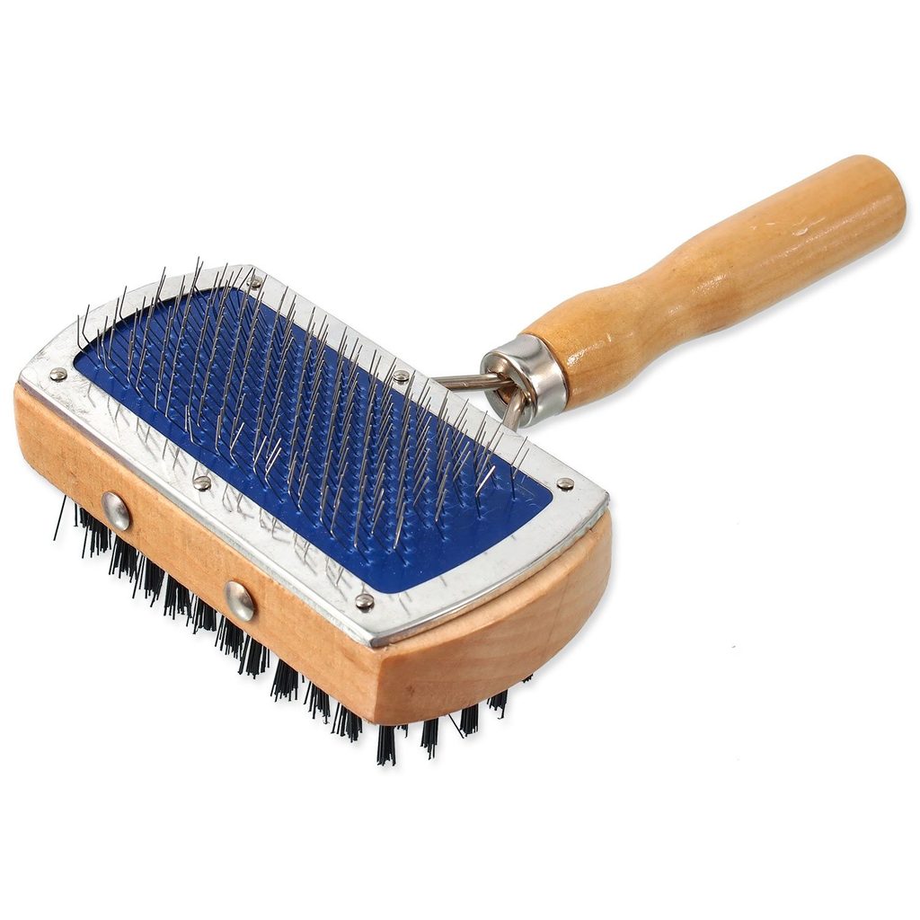 Kartáč Dog Fantasy drátky/nylon oboustranný hranatý 17cm Oboustranný dřevěný hranatý kartáč. Extra jemné drátěné štětiny odstraní prach a odumřelou srst a podsadu. Nylonový kartáč zajistí pak lesk srsti.