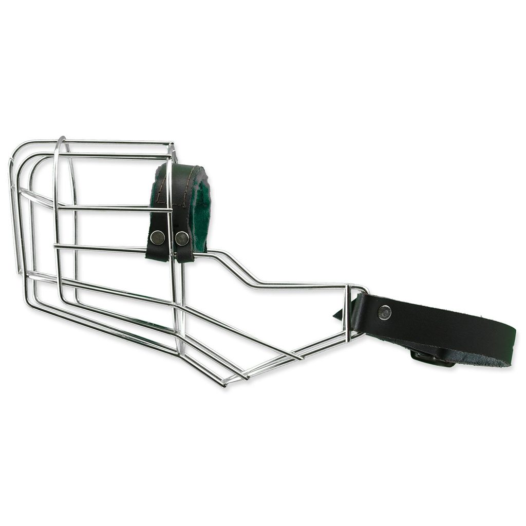 Kovový náhubek s koženými řemínky na zapínání.