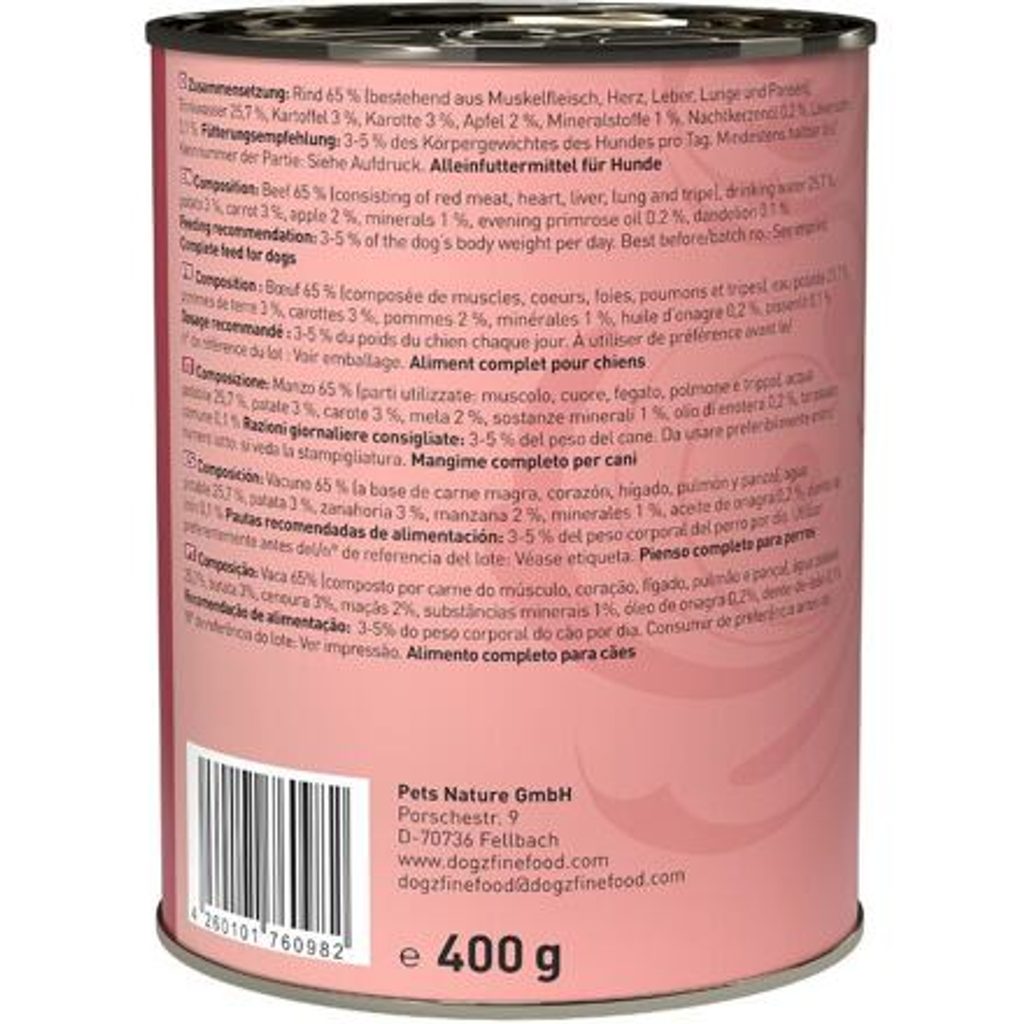 Krmivo pro psy, které obsahuje vysoký podíl chutného hovězího masa, zdraví prospěšnou mrkev, brambory, jablka a smetánku lékařskou. Můžete objednávat po 1 kuse. Obchodní balení 6 ks. Lahodné