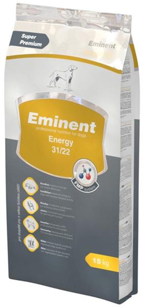 Eminent Energy 15 kg Popis produktu: Kompletní krmivo pro dospělé psy s velkou fyzickou zátěží. Krmivo plně respektuje požadavky na výživu aktivních, sportovních a pracovních psů při náročné fyzické zátěži. Vysoká hladina lehce stravitelných bílkovin (drůbeží maso), kvalitních tuků (drůbeží tuk, kokosový olej), L-karnitinu a vitamínů obnovuje svalovou tkáň, dodává psům dostatek energie a zajišťuje vynikající kondici a vitalitu. Chondroitin, glukosamin a mangan v chelátové formě vyživují pohybový aparát. Krmivo je obohaceno o betaglukany posilující imunitu a FMP systém, který má vliv na dobré trávení. Složení: Drůbeží moučka (32 %), kukuřice, drůbeží tuk, rýže, rybí moučka, slunečnicová semínka, pšeničné klíčky, hydrolyzovaná drůbeží játra, lněné semínko, kvasnice, kokosový olej, MOS (mannanoligosacharidy), FOS (fruktooligosacharidy), betaglukany, doplňkové látky, lysin, methionin, cholin-chlorid, L-karnitin, glukosamin, chondroitin-sulfát, biotin, probiotická kultura. Analytické složky: Protein 31 %, tuk 22 %, vláknina 2,5 %, vápník 1,6 %, fosfor 1,1 %. Dávkování: Doporučená denní krmná dávka hmotnost dospělého psa množství 5 kg 80-110 g 10 kg 140-200 g 20 kg 230-300 g 35 kg 330-450 g 60 kg 480-560 g 80 kg 590-680 g Doporučené krmné dávky jsou orientační. Granule podávejte suché nebo vlhčené vodou či vývarem. Společně s krmivem dejte vždy psovi k dispozici dostatek čerstvé vody.