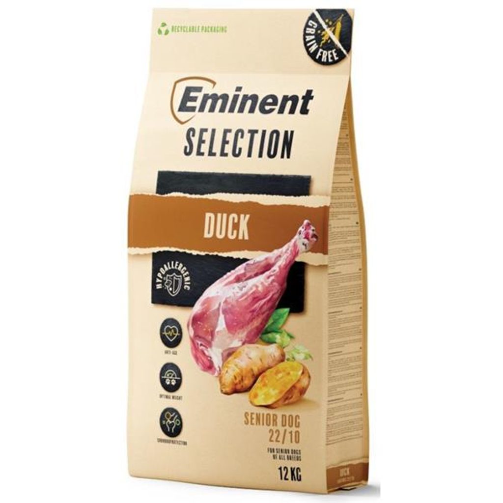 Eminent Selection Senior Duck 12 kg Eminent Selection Senior Duck 12 kg Kompletní hypoalergenní bezobilné (grain-free) krmivo určené pro starší psy všech plemen. Obsahuje kachní protein, který je velmi chutný a poskytuje všechny důležité esenciální aminokyseliny nezbytné pro správnou funkci svalů, tkání a imunitního systému. V receptuře nejsou použity žádné obiloviny, díky čemuž jsou granule lehce stravitelné a vhodné i pro psy s citlivým zažíváním. Aby nedocházelo k rozvoji nadváhy či obezity, má krmivo nižší obsah tuků a vyšší hladinu L-karnitinu. Ten nejen snižuje množství tělesného tuku, ale navíc zlepšuje srdeční a mozkovou činnost a působí proti únavě. Ve starším věku potřebuje pes i dostatečnou a kvalitní výživu kloubů, šlach i vazů, proto mají granule vysoký obsah chondroprotektiv. Hlavní přednosti: vysoká stravitelnost a chutnost, herbal komplex – rakytník, zelený čaj, kurkuma, ostropestřec a beta-glukany pro posílení imunitního systému, anti-age taurin a vitamíny E a C – pomáhají chránit organismus proti předčasnému stárnutí, L-karnitin a snížený obsah tuků – pro udržení optimální hmotnosti, chondroprotektiva – podpora pohybového aparátu, plně recyklovatelný obal – po spotřebování krmiva vyhoďte obal do žlutého kontejneru. Složení: batáty, kachní protein 20 % (dehydrovaný 17 %, hydrolyzovaný 3 %), hrách, bramborový škrob, drůbeží tuk, lněné semínko, chondroprotektiva (kolagen, MSM, glukosamin, chondroitin), lososový olej, beta-glukany, čekankový inulin (zdroj FOS), mannanoligosacharidy (MOS), bylinný komplex 0,22 % (ostropestřec, rakytník, zelený čaj, kurkuma), taurin, L-karnitin, doplňkové látky (vitamíny, stopové prvky, aminokyseliny). Analytické složky: hrubý protein 22 %, hrubý tuk 10 %, hrubý popel 8,5 %, hrubá vláknina 3 %, vápník 1,2 %, fosfor 0,9 %, lysin 2,2 %, methionin 0,6 %, omega-6 mastné kyseliny 1,9 %, omega-3 mastné kyseliny 0,5 %, kolagen 6 870 mg/kg, MSM 200 mg/kg, glukosamin 200 mg/kg, chondroitin 180 mg/kg. Nutriční doplňkové látky na 1 kg: Vitamíny: vitamín A (3a672a) 20 100 m.j., vitamín D3 (3a671) 2 000 m.j., vitamín E (3a700i) 290 mg, cholin-chlorid 690 mg, biotin 3,2 mg, L-karnitin 100 mg, taurin 500 mg. Stopové prvky: měď (3b405) 17,9 mg, zinek (3b603, 3b607) 172 mg, mangan (3b502, 3b506) 62 mg, železo (3b103) 370 mg, jód (3b202) 2,52 mg, selen (3b801, 3b812) 0,34 mg. Dávkování: hmotnost psa 1 kg 5 kg 10 kg 15 kg 20 kg 30 kg 40 kg 50 kg 60 kg 70 kg denní krmná dávka 45 g 90 g 185 g 230 g 280 g 390 g 500 g 600 g 700 g 770 g Údaje uvedené v tabulce jsou pouze orientační. Krmnou dávku upravujte dle individuálních potřeb psa. Granule podávejte suché nebo vlhčené vodou či vývarem. Psovi vždy zajistěte čerstvou pitnou vodu.