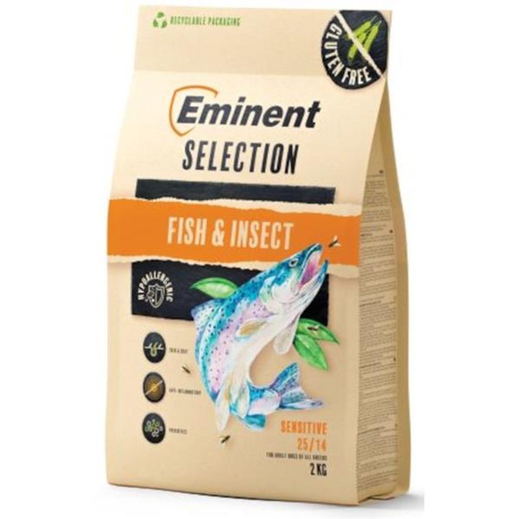 Eminent Selection Sensitive Fish&Insect 2 kg Eminent Selection Sensitive Fish&Insect 12 kg Kompletní bezlepkové (gluten-free) krmivo určené pro dospělé psy všech plemen. Krmivo je speciálně vyvinuté pro psy, kteří trpí průjmy, kožními problémy nebo mají potravinové alergie. Hlavními surovinami bezlepkového krmiva jsou lehce stravitelná rýže a rybí protein poskytující dostatek živin a esenciálních aminokyselin, důležitých pro tvorbu a regeneraci svalů a tkání. Další dobře stravitelnou ingrediencí je hmyzí protein, který má vysoký obsah bílkovin, vitamínů a minerálů a spolu s lososovým olejem a rakytníkem pozitivně ovlivňuje vzhled kůže a srsti. Pro podporu zdraví kloubů obsahuje krmivo chondroprotektiva. Hlavní přednosti: vysoká stravitelnost a chutnost, podpora střevní mikroflóry – čekankový inulin jako zdroj fruktooligosacharidů a kvasnice jako zdroj mannanoligosacharidů, herbal komplex – rakytník, zelený čaj, kurkuma, ostropestřec a beta-glukany pro posílení imunitního systému, omega-3 mastné kyseliny – mají protizánětlivý účinek, snižují svědění kůže a zlepšují její hydrataci, podporují zdraví kůže a lesk srsti, chondroprotektiva – podpora pohybového aparátu, plně recyklovatelný obal – po spotřebování krmiva vyhoďte obal do žlutého kontejneru. Složení: rýže, rybí protein 21 % (dehydrovaný 12 %, hydrolyzovaný 9 %), hrách, drůbeží tuk, hmyzí dehydrovaný protein (5 %), lněné semínko, cukrovarské řízky, chondroprotektiva (kolagen, MSM, glukosamin, chondroitin), lososový olej, beta-glukany, čekankový inulin (zdroj FOS), mannanoligosacharidy (MOS), bylinný komplex 0,22 % (ostropestřec, rakytník, zelený čaj, kurkuma), taurin, L-karnitin, doplňkové látky (vitamíny, stopové prvky, aminokyseliny). Analytické složky: hrubý protein 25 %, hrubý tuk 14 %, hrubý popel 7,3 %, hrubá vláknina 2,7 %, vápník 1,3 %, fosfor 1 %, lysin 2,1 %, methionin 0,6 %, omega-6 mastné kyseliny 2,7 %, omega-3 mastné kyseliny 1,2 %, kolagen 6 870 mg/kg, MSM 200 mg/kg, glukosamin 200 mg/kg, chondroitin 180 mg/kg. Nutriční doplňkové látky na 1 kg: Vitamíny: vitamín A (3a672a) 20 100 m.j., vitamín D3 (3a671) 2 000 m.j., vitamín E (3a700i) 290 mg, cholin-chlorid 950 mg, biotin 3,2 mg, L-karnitin 120 mg, taurin 500 mg. Stopové prvky: měď (3b405) 17 mg, zinek (3b603, 3b607) 189 mg, mangan (3b502, 3b506) 65,4 mg, železo (3b103) 150 mg, jód (3b202) 2,31 mg, selen (3b801, 3b812) 0,5 mg. Dávkování: hmotnost psa 5 kg 10 kg 15 kg 20 kg 30 kg 40 kg 50 kg 60 kg 70 kg denní krmná dávka 90 g 160 g 220 g 270 g 360 g 480 g 580 g 675 g 740 g Údaje uvedené v tabulce jsou pouze orientační. Krmnou dávku upravujte dle individuálních potřeb psa. Granule podávejte suché nebo vlhčené vodou či vývarem. Psovi vždy zajistěte čerstvou pitnou vodu.