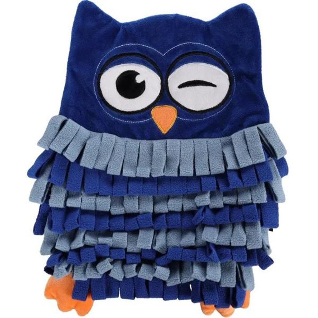 Čmuchací kobereček Sova modrá Flamingo 33x27cm Čmuchací kobereček Sova modrá Flamingo Čmuchací kobereček je skvělou interaktivní hrou, která je založená na pachové práci. Zapojuje nejen čich psa, ale i zrak, hmat, chuť a také celkovou koordinaci těla. Díky čmuchacímu koberečku pes cvičí koncentraci a sebeovládání. Pomáhá při výchově a celkovému zklidnění hyperaktivních psů. Je vhodný pro všechny: od štěněte po psího seniora. Kobereček obsahuje protiskluzovou tkaninu a má podobu roztomilé sovy. Použití: Schovejte do koberečku pamlsky nebo granule a nechte psa je hledat. Barva: modrá Rozměry: 27 x 2,5 x 33 cm