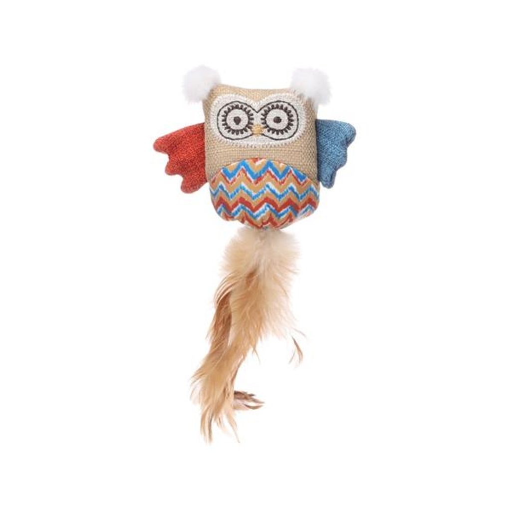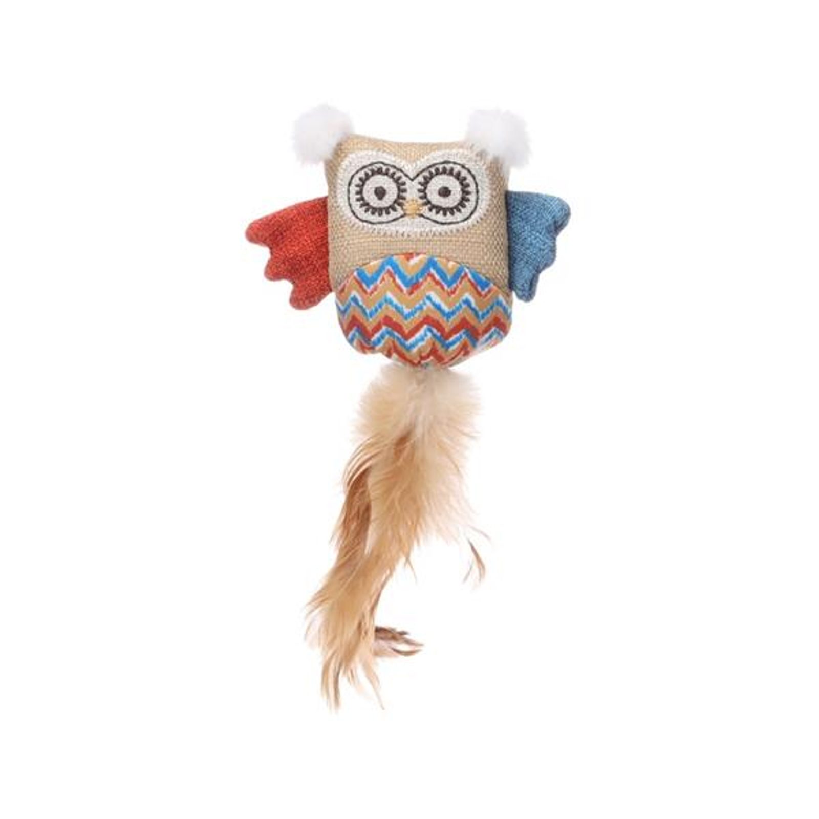 Hračka cat textil Robla sova Flamingo Hračka cat textil Robla sova Flamingo Textilní hračka ve tvaru sovy kombinuje různé druhy látek – plátno, plyš a tkaninu s výrazným chevronovým vzorem. Uvnitř hračky je catnip (šanta kočičí), jehož vůně povzbuzuje ke hře až 70 % koček. Pro ještě větší zábavu má sova šustivou výplň a ocásek z pravých pírek. Rozměry (cca): 11 × 3,7 × 21 cm Materiál: polyester, peří Barva: béžová, modrá, červená Upozornění: Hračka není určena dětem. Kočky mohou reagovat na vůni šanty kočičí rozdílně. Na kočku při hře dohlížejte a hračku jí nechávejte k dispozici pouze na omezenou dobu. Hračku pravidelně kontrolujte a v případě poškození přestaňte používat.