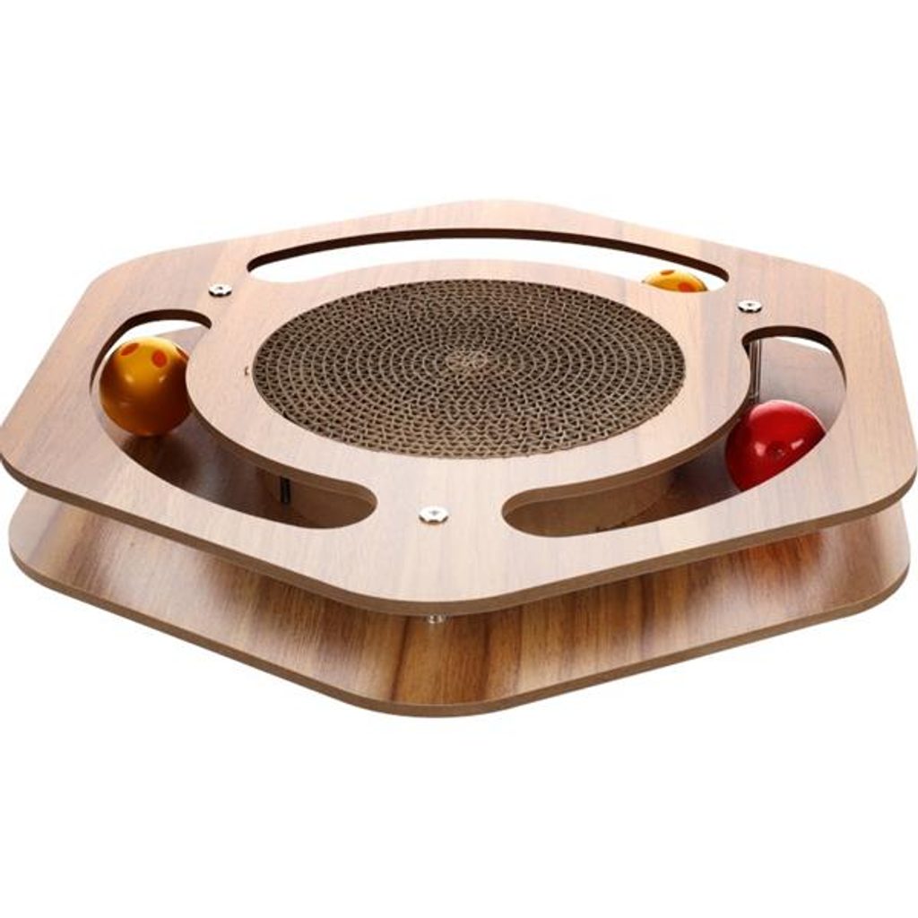 Hračka kočka dřevěné hřiště - šestiúhelník 35x31,5x4,5cm Hračka kočka dřevěné hřiště - šestiúhelník 35x31,5x4,5cm Flamingo přináší interaktivní hračku pro kočky spojenou se škrabadlem. Celý šestiúhelník je vyroben z MDF desek, ale potažený folií imitující dřevo, hračka tak ihned získává na atraktivnosti pro lidské oko. Ve středu hračky je kruhové škrabadlo z vlnité lepenky. Po obvodu šestiúhelníku jsou 3 průřezy, ve kterých se mohou volně pohybovat míčky. Míčky jsou plastové, barevné s otvory a rolničkami. Kočky mají možnost lovit tři míčky najednou a zabavit se tak na delší dobu. K hračce je přidán pytlík šanty kočičí, abyste kočku nalákali na první použití hračky. Interaktivní hračky pro kočky, podporují jejich přirozenou hravost a smysl pro lov. Rozměry: 35 x 31,5 x 4,5 cm