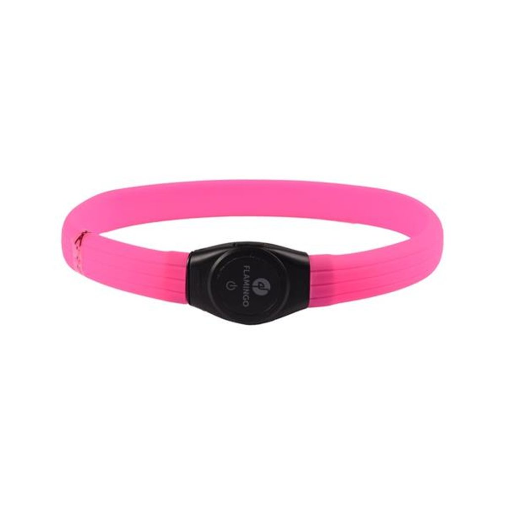 Obojek svítící Ilona Visio 35-64cm růžový Flamingo Obojek svítící Ilona Visio 35-64cm růžový Flamingo Svítící obojek zajistí vám a vašemu psovi bezpečné venčení za snížené viditelnosti. LED světlo je viditelné na vzdálenost až 500 metrů a nabízí tři světelné režimy. Obojek je vyrobený ze silikonu a má ochranu IP44 proti ostrým předmětům a stříkající vodě. Dobíjí se pomocí přiloženého micro USB kabelu a součástí balení je i dobíjecí baterie LIR2032. Délku obojku lze přizpůsobit zastřižením v rozsahu 35–64 cm. Rozměry (cca): A = 35–64 cm, B = 0,7 cm (viz obrázek) Materiál: silikon Barva: růžová