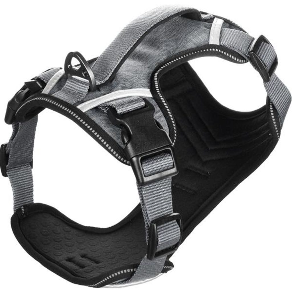 Postroj nylon Heron šedý 2,5x70-98cm Flamingo Postroj nylon Heron šedý 2,5x70-98cm Flamingo Hrudní postroj pro psy Flamingo Heron je vyroben z pevného a voděodolného nylonu a má měkkou neoprenovou podšívku. Postroj je plně nastavitelný, takže lze snadno přizpůsobit tvaru těla psa. Zapíná se pomocí dvou plastových přezek. Pro připnutí vodítka slouží kovové kroužky s matně šedou povrchovou úpravou – jeden na zádech a jeden na hrudi, který pomáhá lépe regulovat tahání a skákání. Pro vyšší bezpečnost je postroj opatřen reflexními prvky. Navíc je vybaven praktickou hřbetní rukojetí pro lepší kontrolu psa v náročných situacích. Velikost: XXL Rozměry (cca): A = 54–74 cm, B = 70–98 cm (viz obrázek) šířka pásku 2,5 cm Materiál: nylon, neopren, kov, plast Barva: šedá