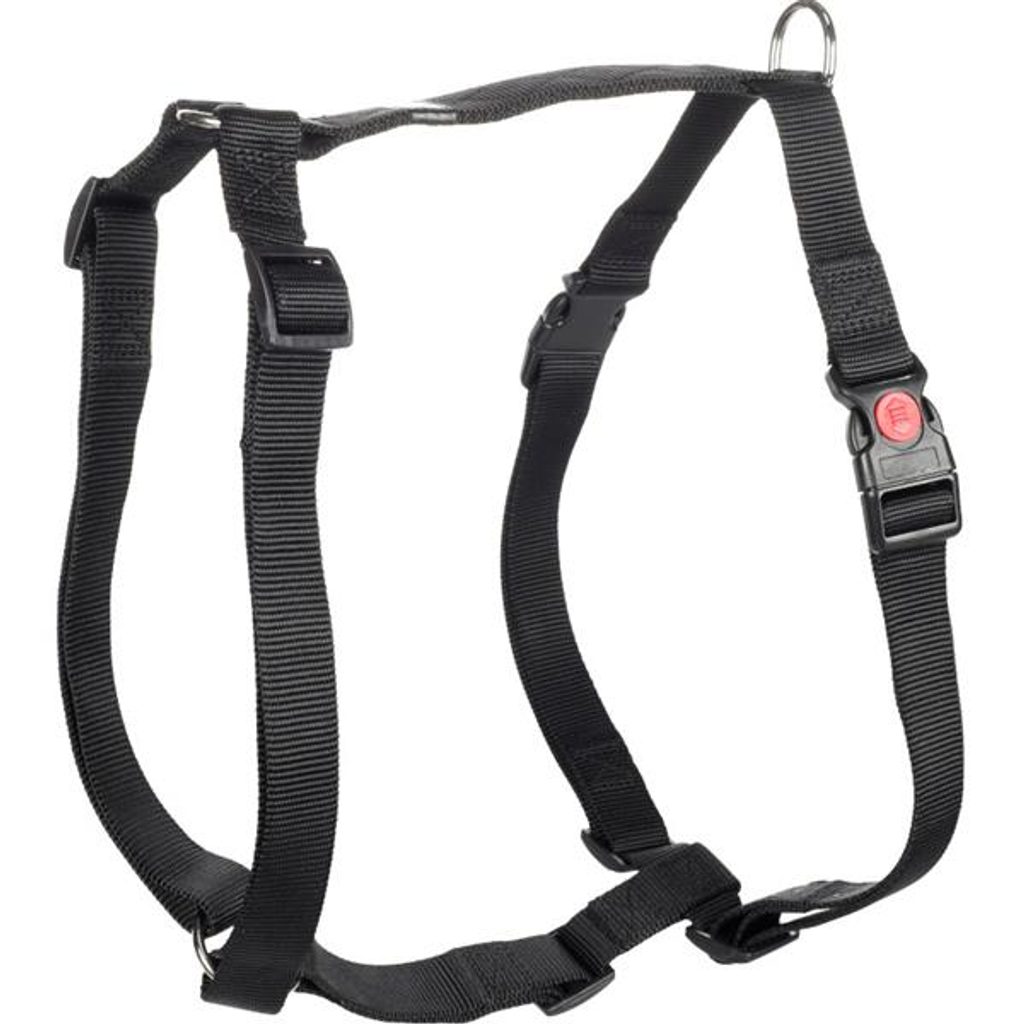 Postroj nylon Ziggi černý XL 2,5x70-110cm Flamingo Postroj nylon Ziggy černý XL 2,5x70-110cm Flamingo Postroj typu H pro psy Flamingo Ziggi je vyroben z pevného a voděodolného nylonu. Postroj je plně nastavitelný, takže lze snadno přizpůsobit tvaru těla psa. Zapíná se pomocí dvou plastových přezek – u velikostí S–XL s bezpečnostní pojistkou. Pro připnutí vodítka slouží kovový D-kroužek s lesklou niklovou povrchovou úpravou. Velikost: XL Rozměry (cca): A = 70–110 cm, B = 85–120 cm (viz obrázek) šířka pásku 2,5 cm Materiál: nylon, kov, plast Barva: černá