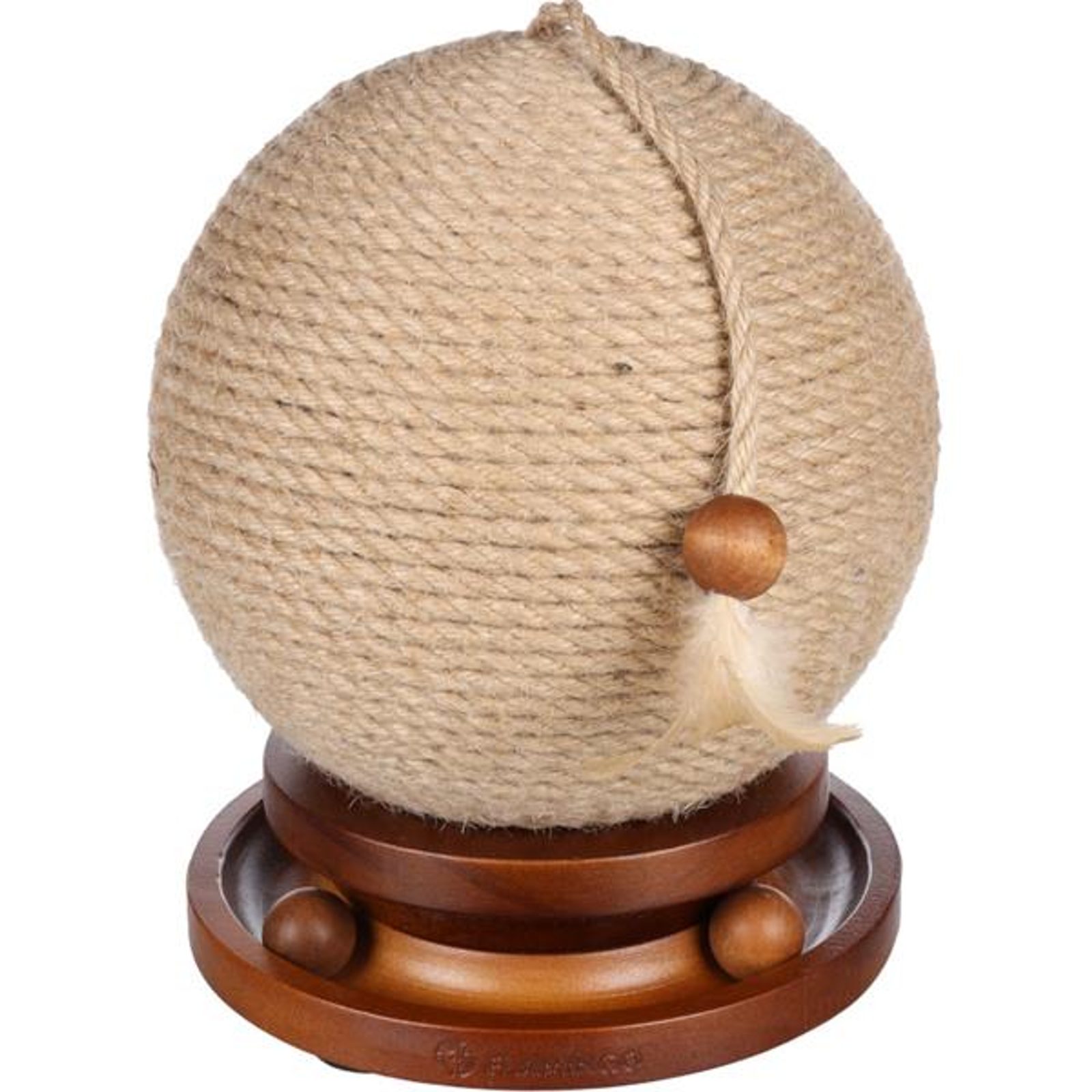 Škrabadlo Isabella koule hnědá ∅ 21cm Flamingo Škrabadlo Isabella koule hnědá Ř 21cm Flamingo Škrabadlo menší velikosti Flamingo Isabella má základnu z robustního borovicového dřeva, na níž je umístěna plastová koule ovinutá jutovým provazem. Pro větší zábavu je ke kouli připevněný provázek s dřevěným korálkem a peříčky a základna je vybavena kuličkovou dráhou. Na spodní straně základny jsou protiskluzové „nožičky“. Rozměry (cca): výška 25 cm základna O 21 cm jutová koule O 21 cm Barva: hnědá Materiál: dřevo, juta a plast.