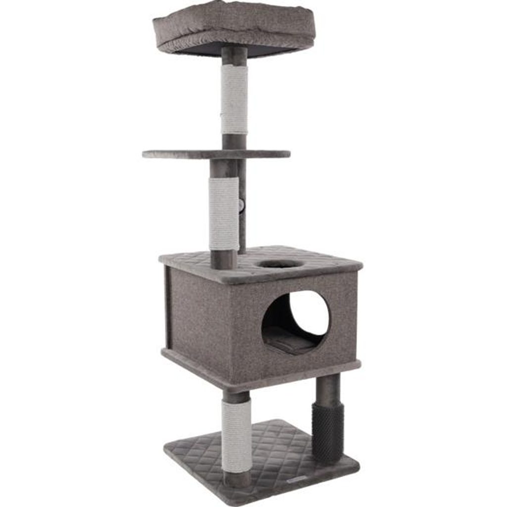 Škrabadlo Teor šedé 142cm Flamingo Škrabadlo Teor šedé 142cm Flamingo Škrabadlo Flamingo Teor je vyrobeno z pevné dřevotřísky a hebké tkaniny. Jeho součástí je škrabací lano, hračka s rolničkou, úkryt a odnímatelný vyhlídkový pelíšek. Na jednom sloupku je navíc gumový kartáč pro příjemnou masáž. Rozměry (cca): výška 142 cm základna 58 × 55 × 2,2 cm sloupky O 7,7 cm vyhlídka O 42 × 10,5 cm domeček 48,5 × 48,5 × 33 cm Barva: šedá Materiál: dřevotříska, pevná textilní látka