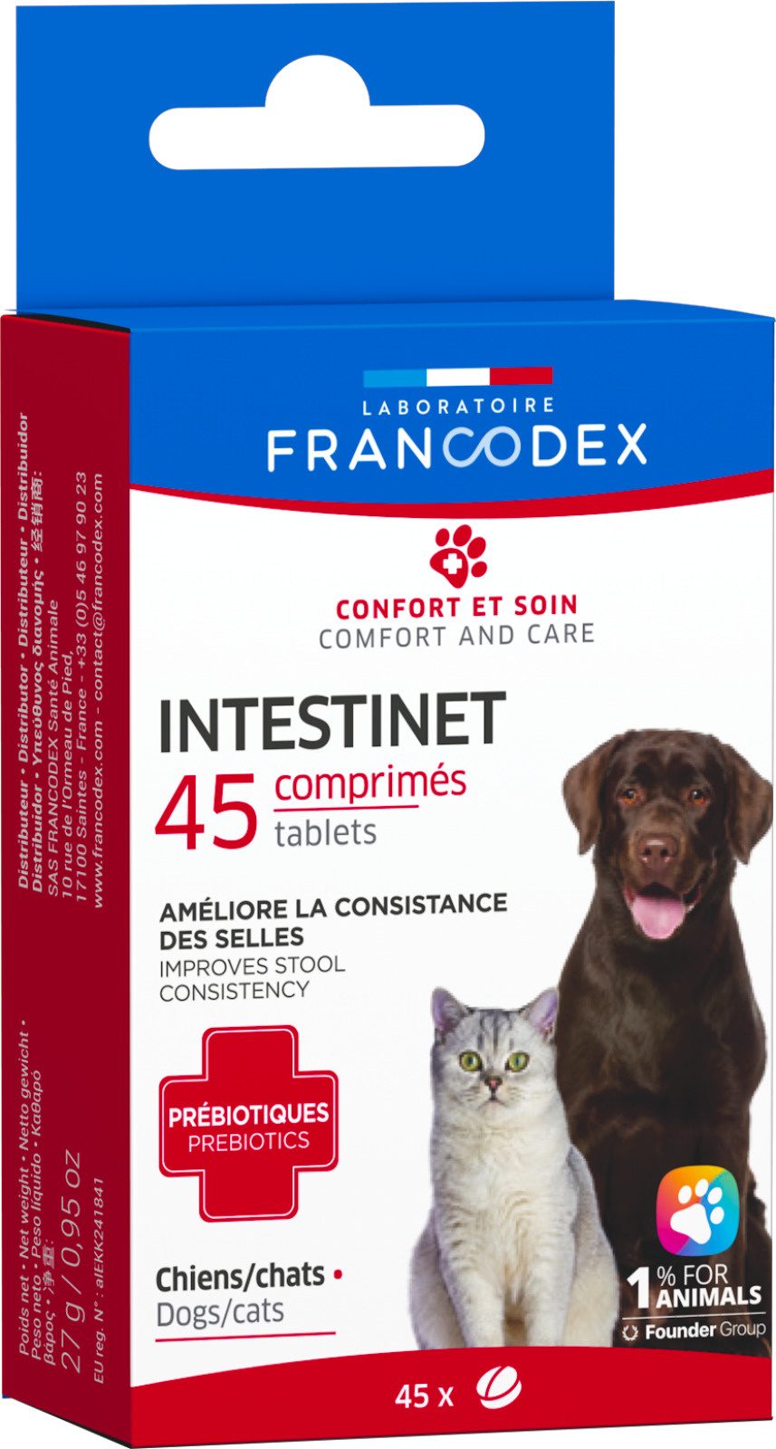 Tablety INTESTINET COMPRIMÉS FRANCODEX jsou speciálně navrženy tak, aby pomohly vašemu mazlíčkovi udržet si dobré střevní zdraví. Tyto tablety jsou vhodné pro psy i kočky a jsou formulovány tak, aby přispívaly k pevnosti stolice, zejména v případě měkké stolice, a zároveň díky pečlivě vybraným složkám podporují trávicí pohodlí.