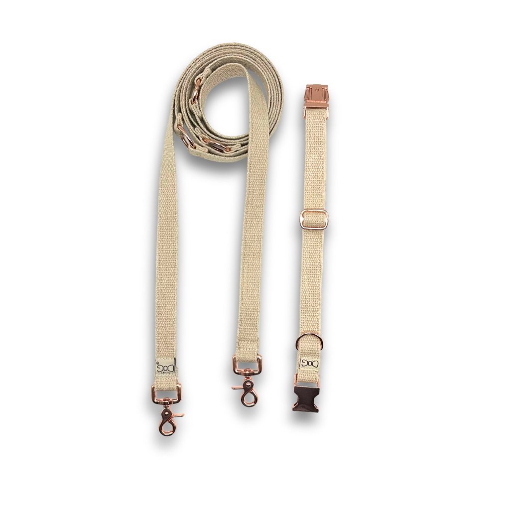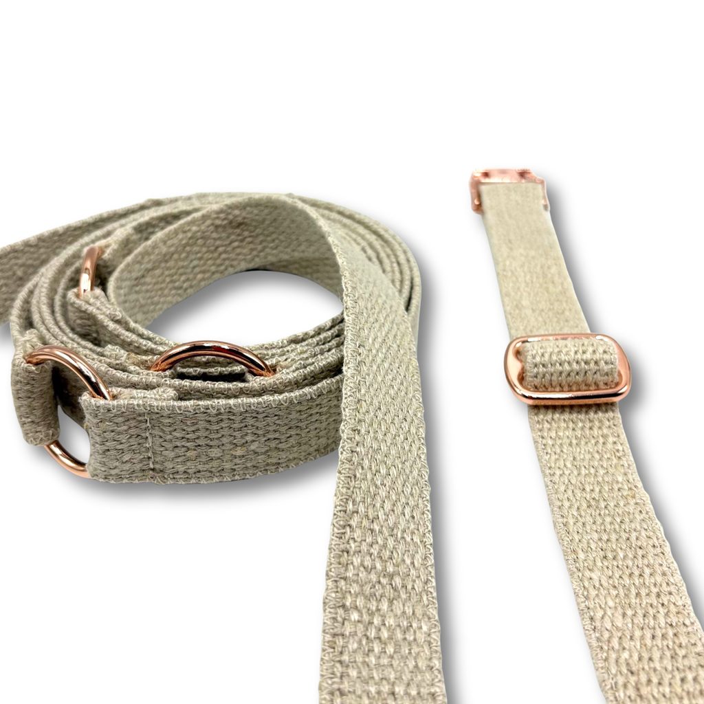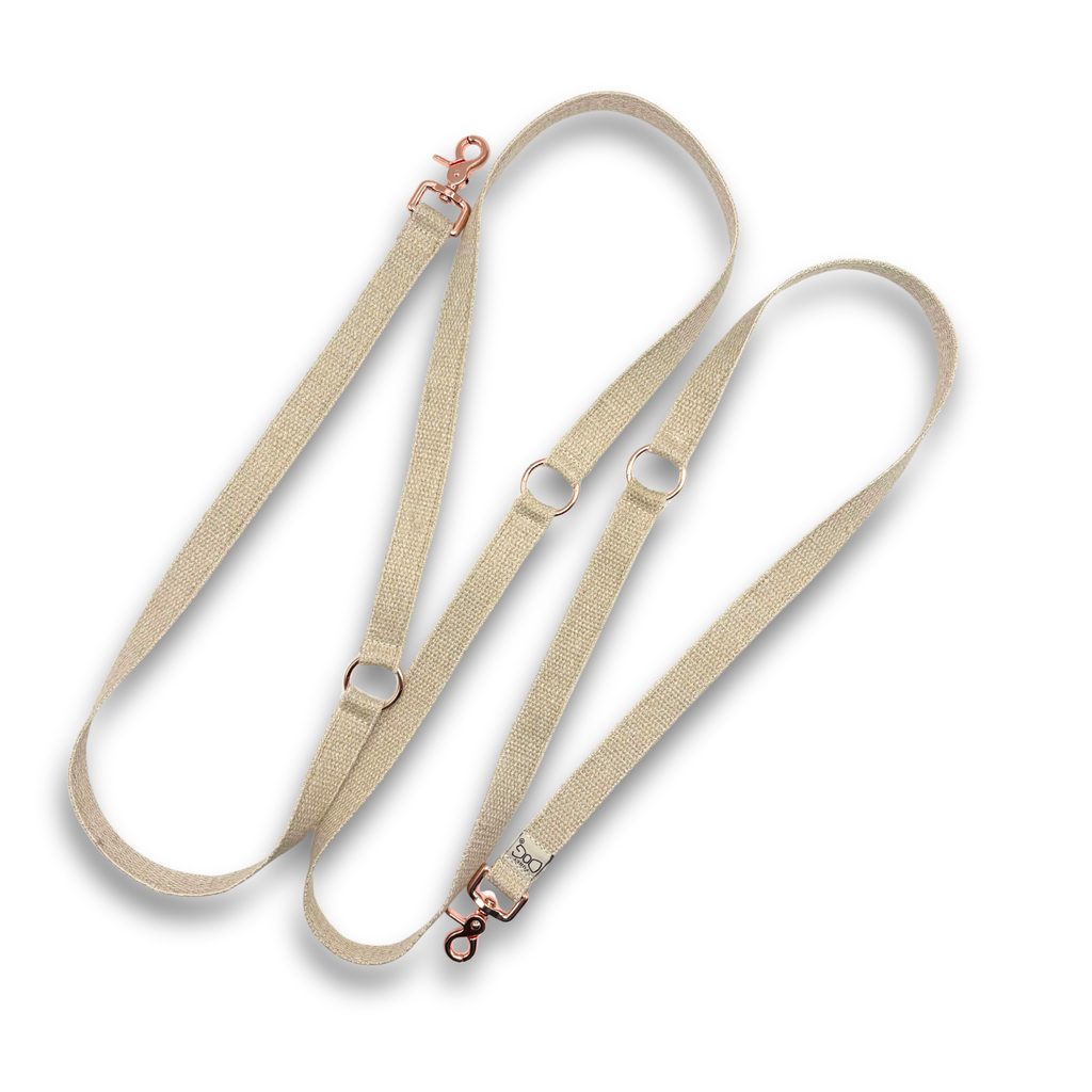 Stylové, pevné a ekologické vodítko pro psy vyrobené z přírodního konopného popruhu s elegantními kovovými komponenty v odstínu růžového zlata. Milujeme kontrast mezi přirozeností a leskem – a víme, že si ho zamilujete taky.