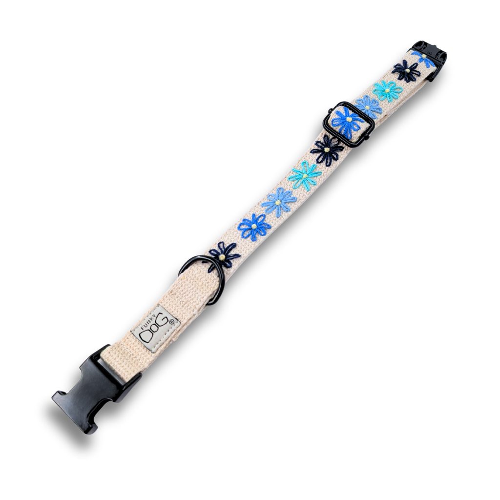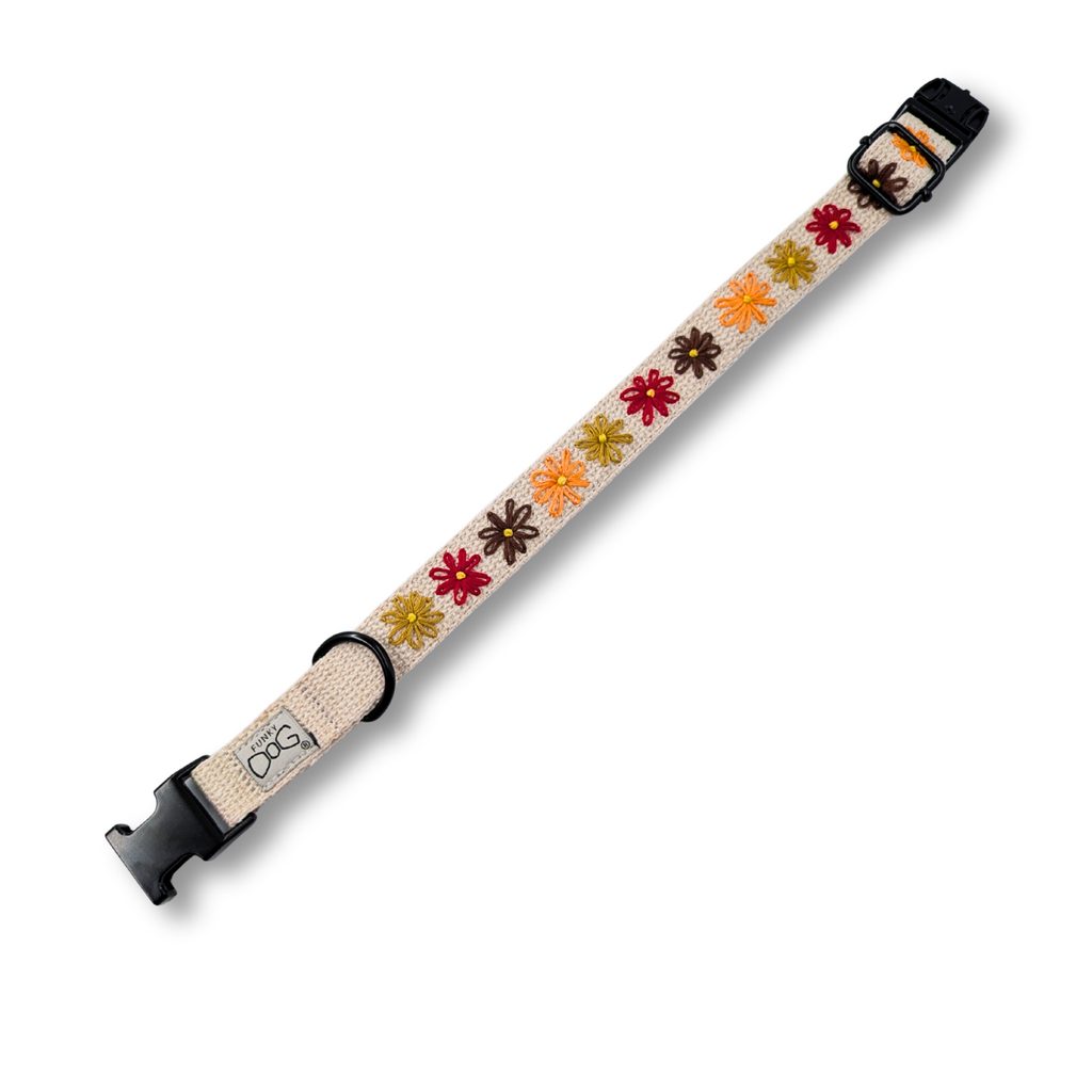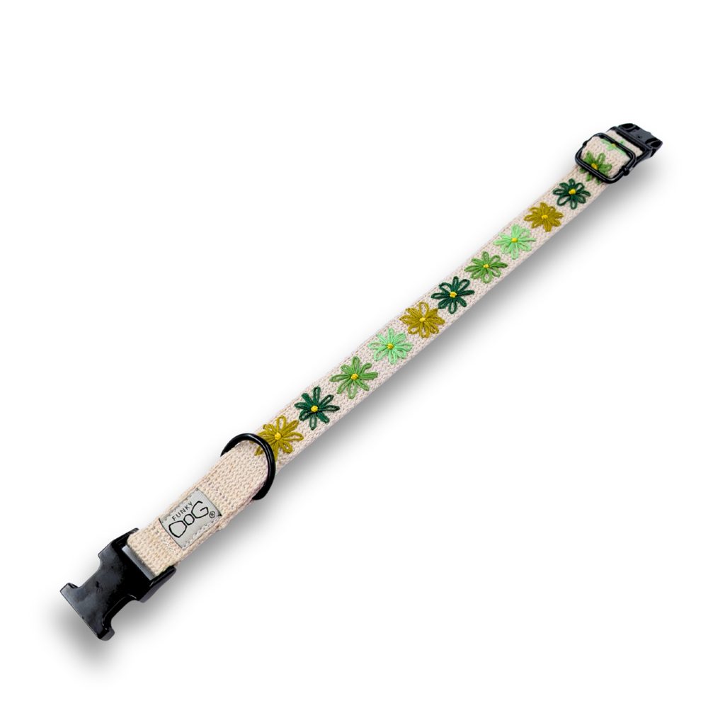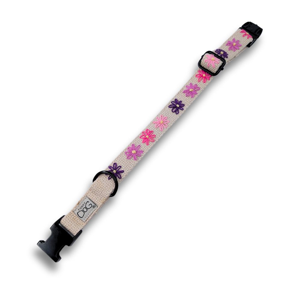 Objevte jedinečný styl a dokonalou praktičnost pro vašeho psa! Náš exkluzivní ručně vyšívaný konopný obojek s roztomilým motivem kytiček je skvělá volba pro módy chtivé i aktivní psy. Každý kus je originál, ručně vyráběný s péčí a láskou.