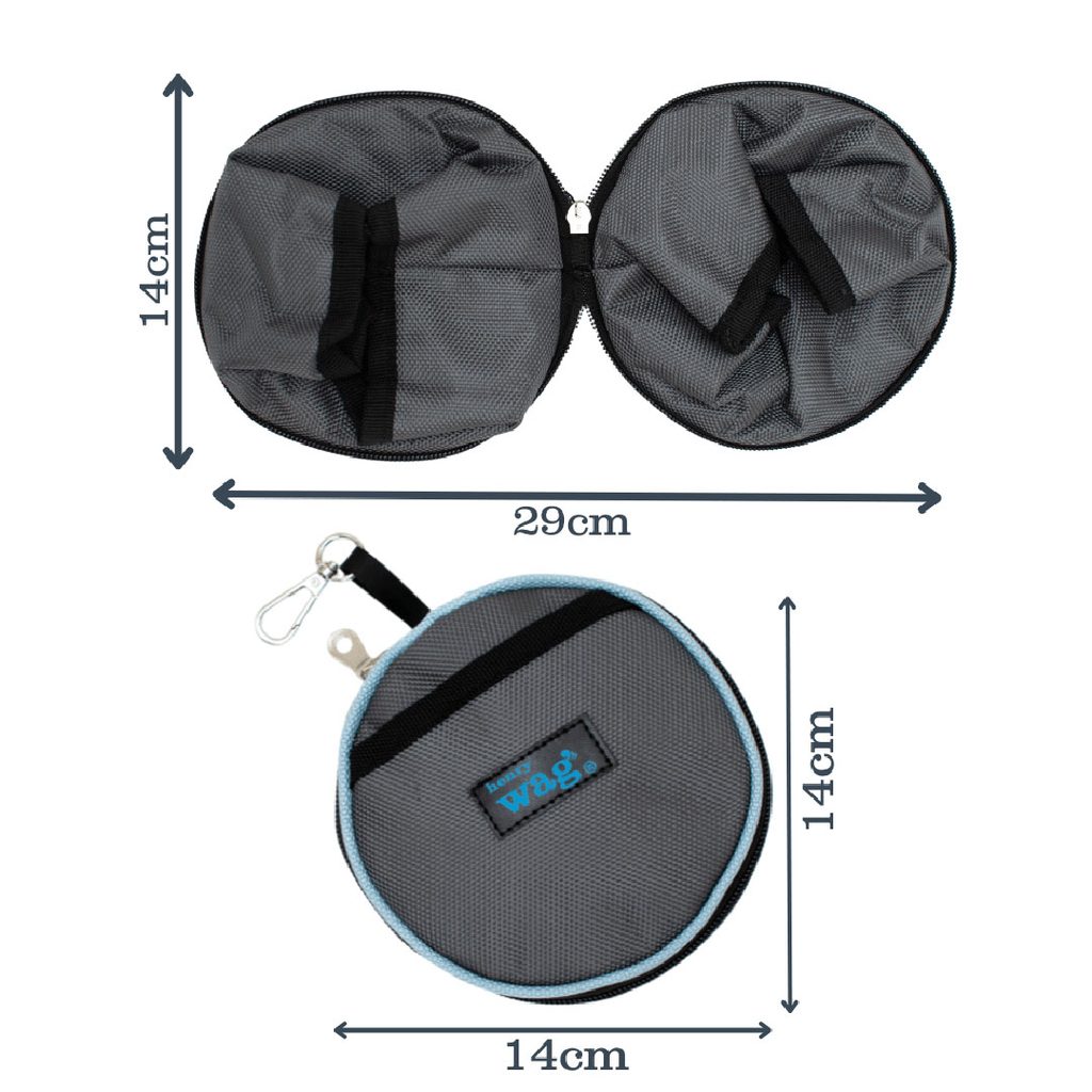 Díky malé velikosti a plochému tvaru v zabaleném stavu ji snadno přibalíte na výlet. Už žádné neskladné cinkající misky v autě nebo batohu. Balení má kvalitní karabinu na pevném poutku pro rychlé a snadné připevnění k opasku, tréninkové tašce nebo k turistickému batohu. Na přední straně balení ja malá kapsička, kterou můžete využít např. na bobkosáčky.