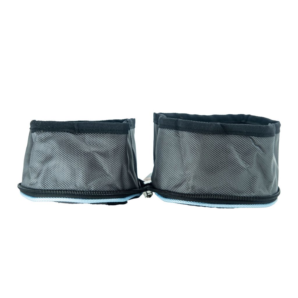 Sada dvou skládacích misek, na vodu i krmení, jednoduše sbalíte na cesty, s karabinou na připnutí k batohu.