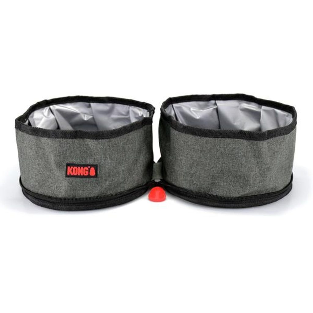 Cestovní skládací miska dvojitá Fold-Up KONG Cestovní skládací miska dvojitá Fold-Up Kong Skladná a lehká sada dvou zipem spojených misek, které jsou vhodné na cesty nebo procházky. Voděodolná vnitřní výstelka vhodná na vodu, mokré nebo suché krmivo. Zapínání na zip pro hygienické skladování. Lze prát v pračce na 30 °C. Karabina pro připevnění k batohu nebo oblečení. Váží pouze 156 gramů! Objem misky: 2 x 2 l