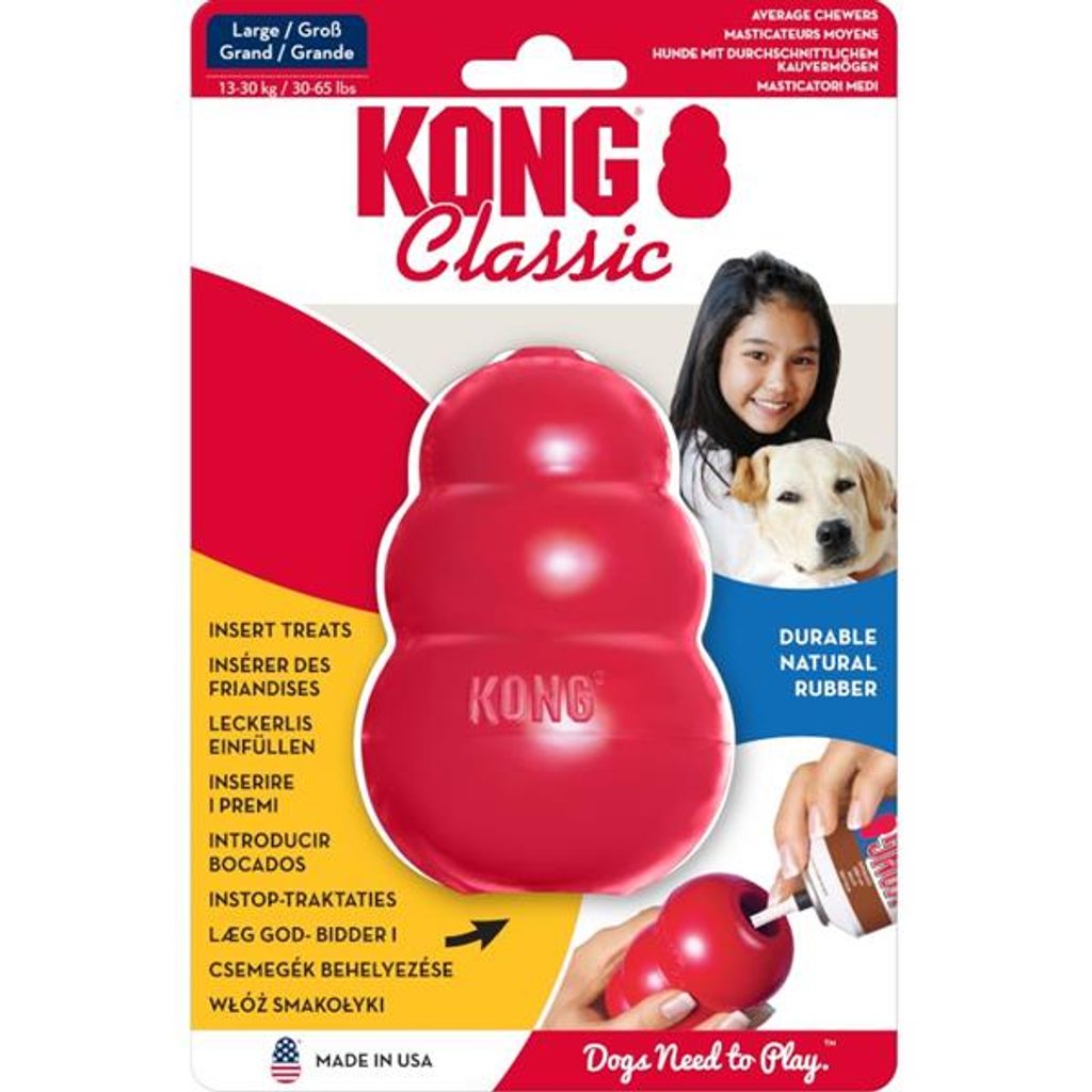 Hračka KONG je interaktivní plnitelná hračka pro psy ze speciální odolné gumy. Je vyrobena z ultra elastického, čistě přírodního kaučuku, který je velmi pružný a zároveň velmi odolný a pevný i pro největší ničitele hraček. Speciální tvar zajišťuje při dopadu nepravidelný odraz. Hračku lze naplnit pamlsky nebo pastou a zvýšit tak zájem psa o hračku.